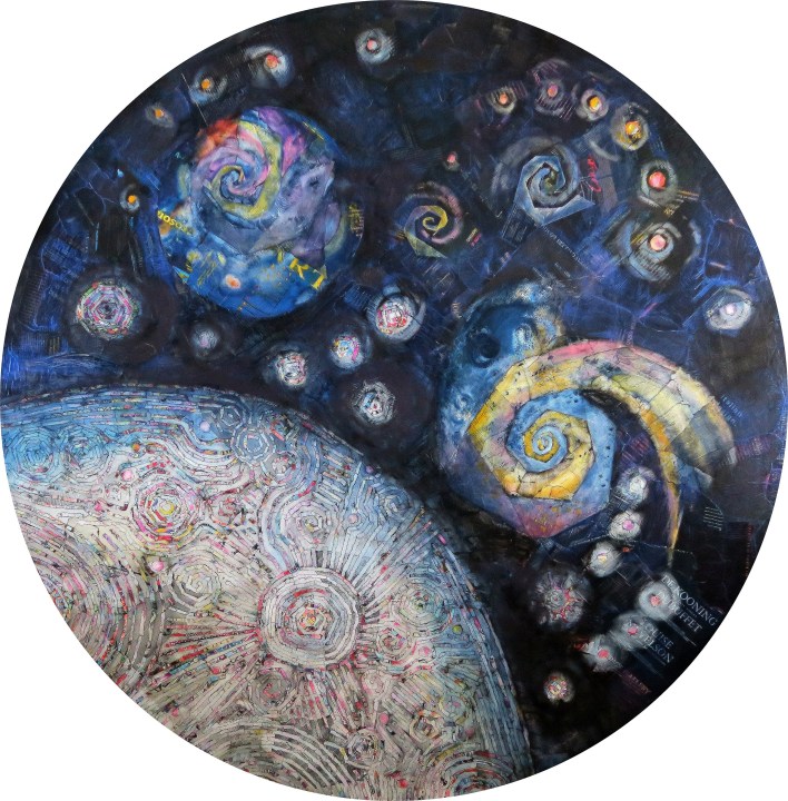 La exposición también cuenta con dos cuadros circulares que le dan inicio y final a la obra central. El arquitecto subrayó que lo que quiso transmitir fue la representación de las galaxias, en uno de ellos, y que el otro simboliza a las serpientes de origen patagónico y mesoamericano. “En esta serpiente flotante vos podes meterte dentro de ella, caminar por dentro. Ella nace y termina en estos dos cuadros gigantes”, subrayó.