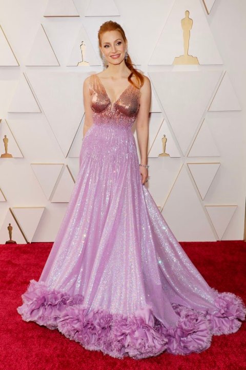 a nominada a Mejor Actriz, por protagonizar “Los ojos de Tammy Faye”, luce un vestido de Gucci que ha demorado 10 años en confeccionarse.