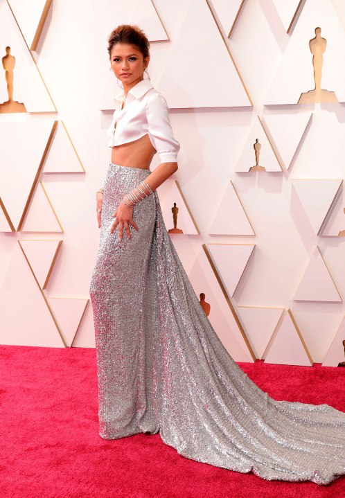 La intérprete de “Dune” ha dejado boquiabierto al público al entrar con una falda plateada y una camisa corta, satinada, de Valentino.