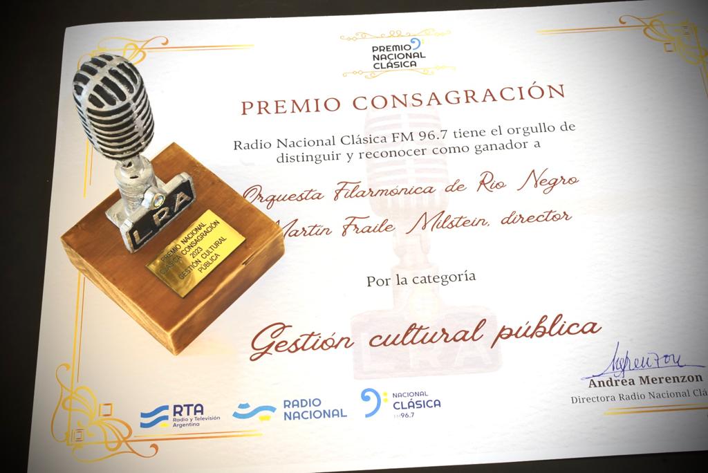La Orquesta Filarmónica de Río Negro recibió 5 premios nacionales de un total de 33 categorías en el marco de los «Premios Nacional Clásica» organizados por Radio Nacional Clásica que integra el sistema público de medios de comunicación.