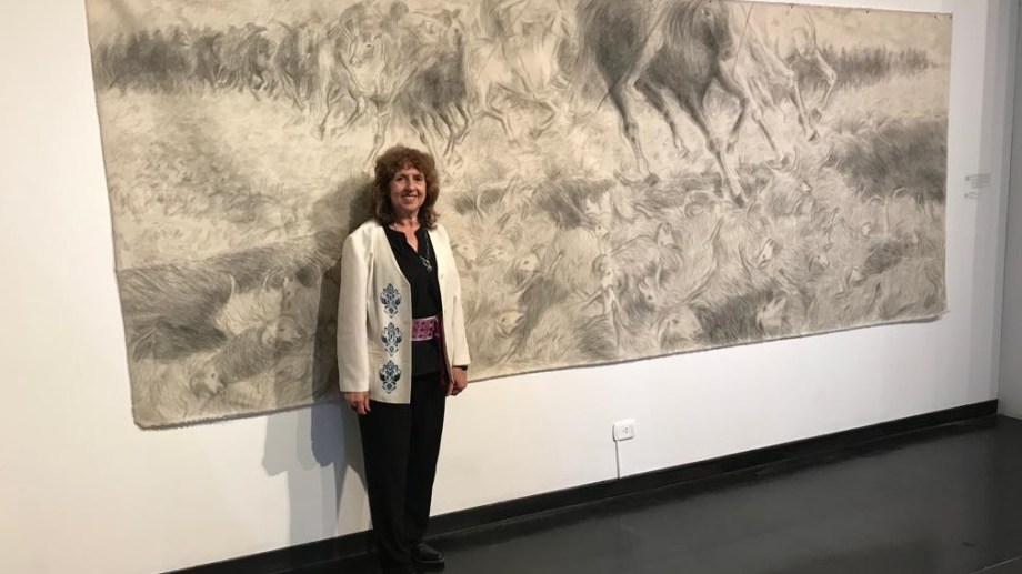Hace meses, Mirta se plantó frente al lienzo que ocupaba todo el piso de su taller, como una escritora que se anima a encarar el vacío de la hoja en blanco. En la tela empezó, cuidadosa, a dar los primeros trazos con la barra de carbón. Pero no improvisaba: su mente y sus manos cargaban varios bocetos, con caballos, jinetes y ovejas levantando polvareda. Con ellos buscó aproximarse cada vez más a la antigua resistencia indígena que conoció al pasar, cuando miraba un documental histórico en You Tube. El relato la dejó pensando.