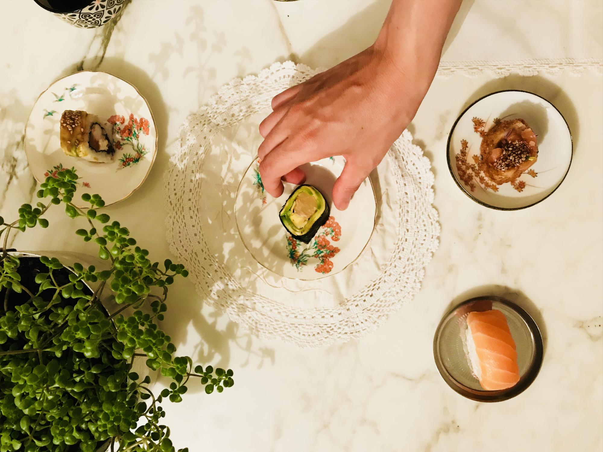 Como dice el protocolo el sushi se debe comer si estás en un restaurante, sentado en una barra con sus palitos, wasabi y jengibre para ir modificando los sabores dentro del paladar. El wasabi porque es picante y sano. Siempre acompañado de un vino blanco y rosado. Personalmente yo lo como con la mano con una buena cerveza o un buen pinot noir patagónico.