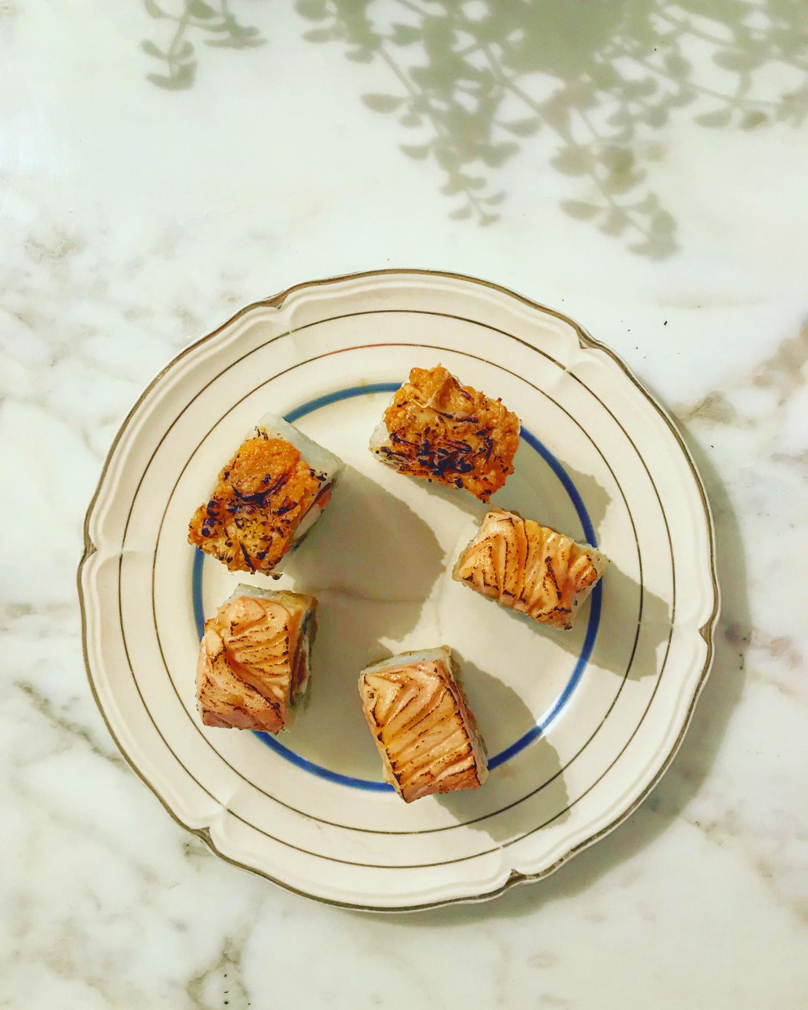 Tengo épocas pero cuando me preparo un roll para mí me gusta cuando el salmón esta en el punto cremoso, mitad crudo, mitad cocido, cebolla morada, verdeo, un dressing ácido, una textura crujiente y kilos de picante, tabasco verde o mi querido wasabi.