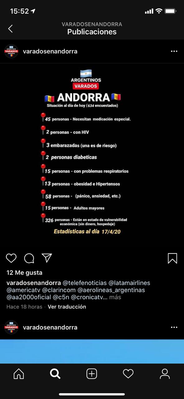 Lucas difunde un informe del gobierno de Andorra que indica que hasta el 17 de abril tienen 634 argentinos encuestados. De ese grupo, se destaca que hay 45 personas que necesitan medicación especial, 58 personas con cuadros de pánico y ansiedad y 326 en estado de vulnerabilidad económica, sin dinero ni hospedaje.
