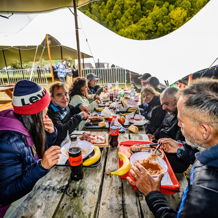 Luego de cada etapa se llega a los campamentos, siempre ubicados en lugares increíbles con costa de lago y con más de 700 carpas cada uno. Ahí los corredores tienen, provistos por la organización, 4 comidas, bebidas y zonas con servicios. Un oasis con todo lo necesario para recuperar energías y descansar. Ahí, cualquier ocasión es un buen momento para charlar e intercambiar experiencias. Cuando un corredor llega al campamento, la bienvenida es un reflejo del disfrute que se replicará durante la carrera. En cuanto cruzas la línea de llegada te reciben con agua, una bebida isotónica, frutas y un sándwich de carne a la parrilla. Voluntarios y un staff que te hacen sentir en un hotel 5 estrellas.