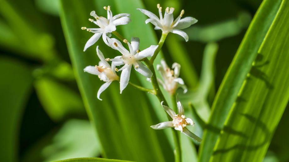 Esta planta perenne forma grupos de tallos arqueados, con hojas alargadas de un verde intenso y flores blancas en forma de campanas colgantes, que aparecen a lo largo de los tallos.