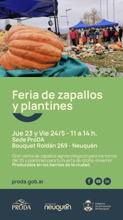 A poco de realizado el evento de cierre del concurso de Agricultura Urbana “Ciudad Zapallo”, el programa ProDA de la Secretaría de Producción e Industria del Gobierno provincial, organizará un Feria Huertera con productos de la agricultura urbana neuquina para impulsar la comercialización local de alimentos y productos de las huertas de los barrios de la ciudad.