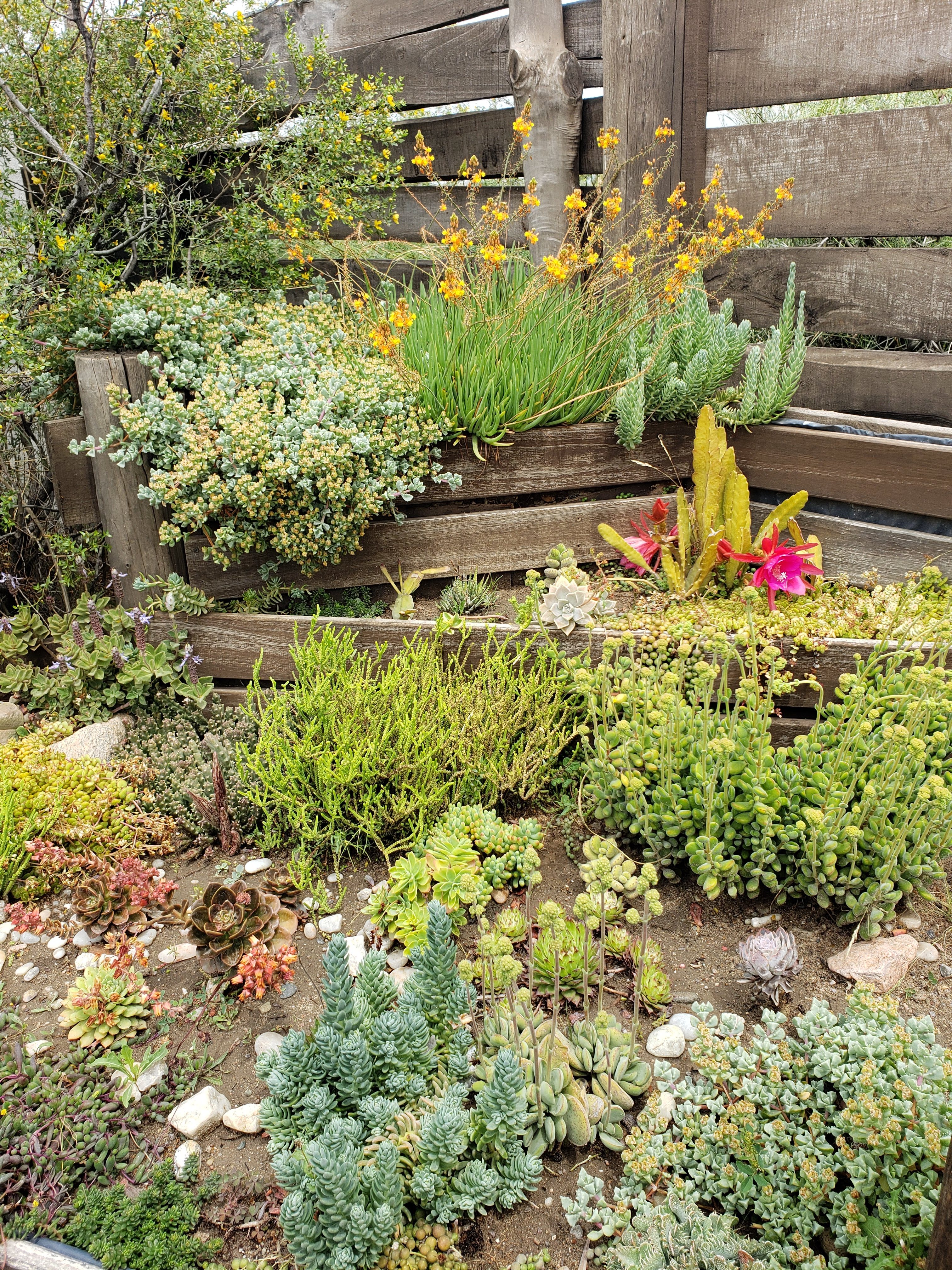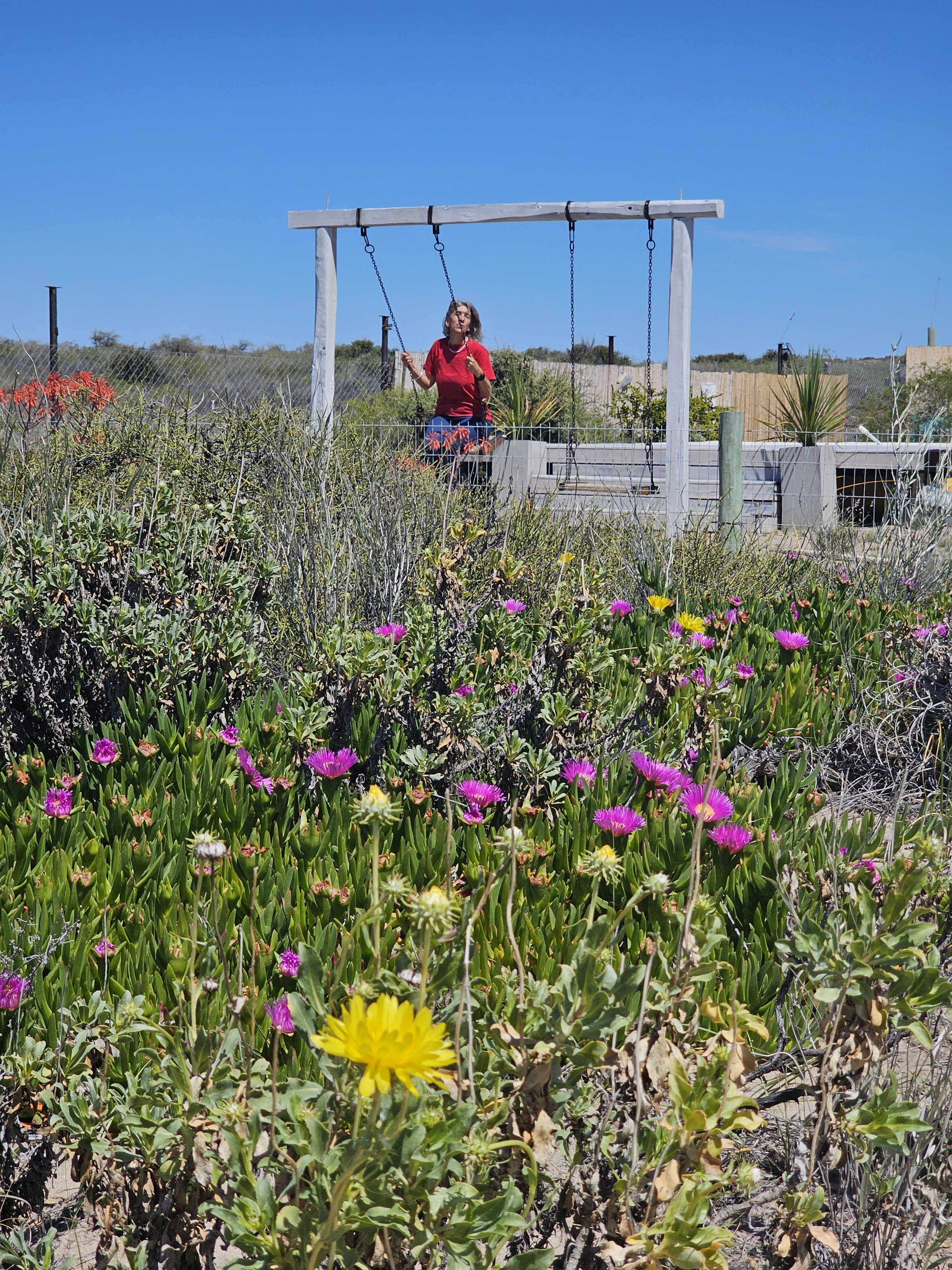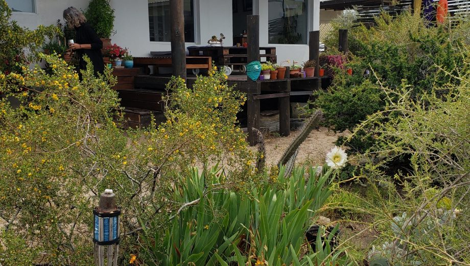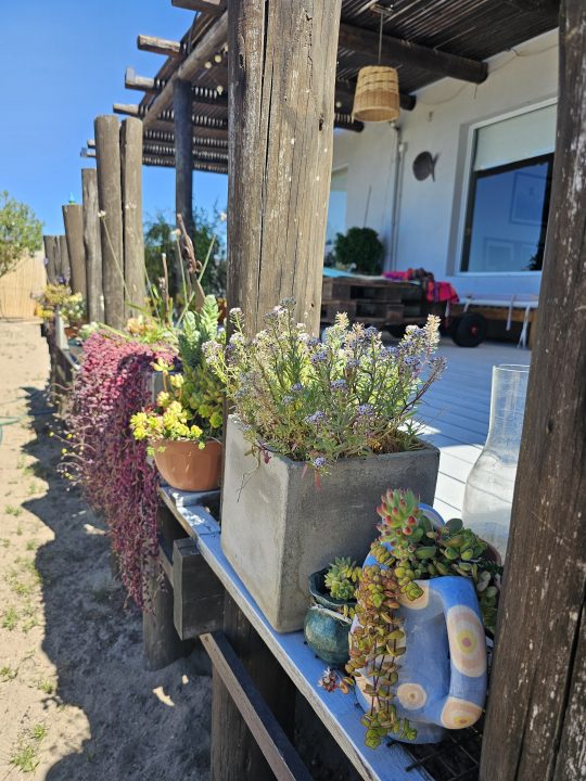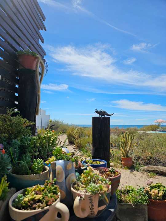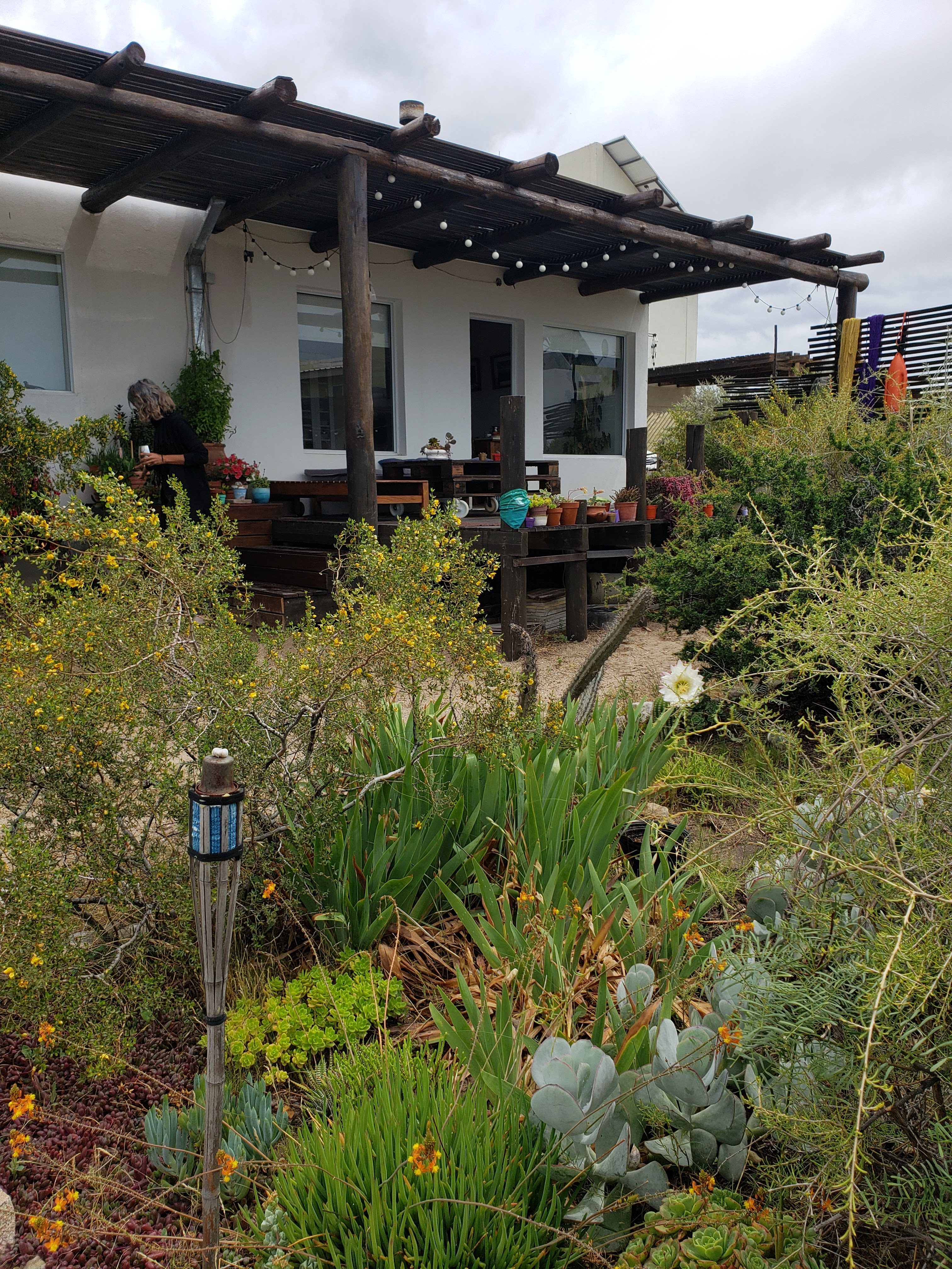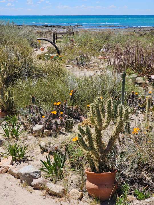 El impacto visual es sorprendente. Las suculentas y cactus entre las jarillas, los moyes y las melosas atraen latención por su vigoridad y variedad. Entre ellas surcan caminos para recorrer el espacio que fueron pensados donde menos vegetación autóctona había y para generar espacios para disfrutar de día o de noche -tanto para refugiarse del viento sur o mirar las estrellas-. Es así como también se arman sitios cobijados donde hay reposeras o mesas con sillas para armar una rica comida mirando el mar.
