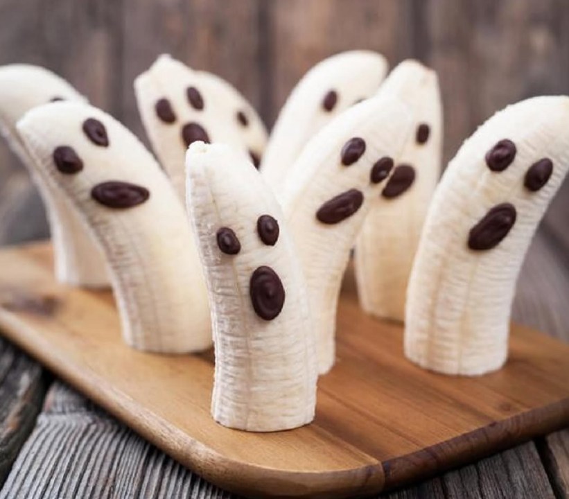 Preparación: cortar la banana en mitades, usar las pasas para hacer los ojos pegados con chocolate derretido. Dejar enfriar para que el chocolate se solidifique.