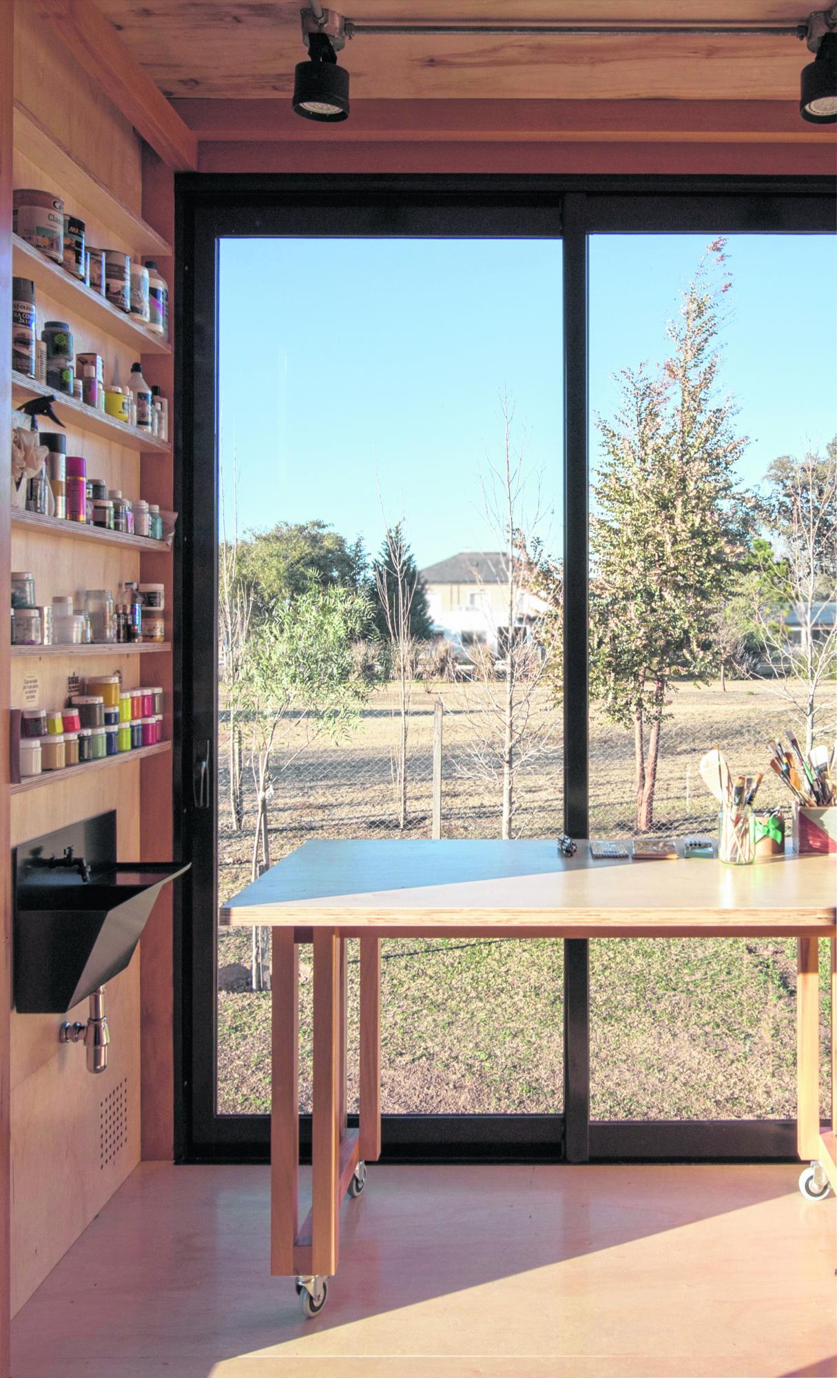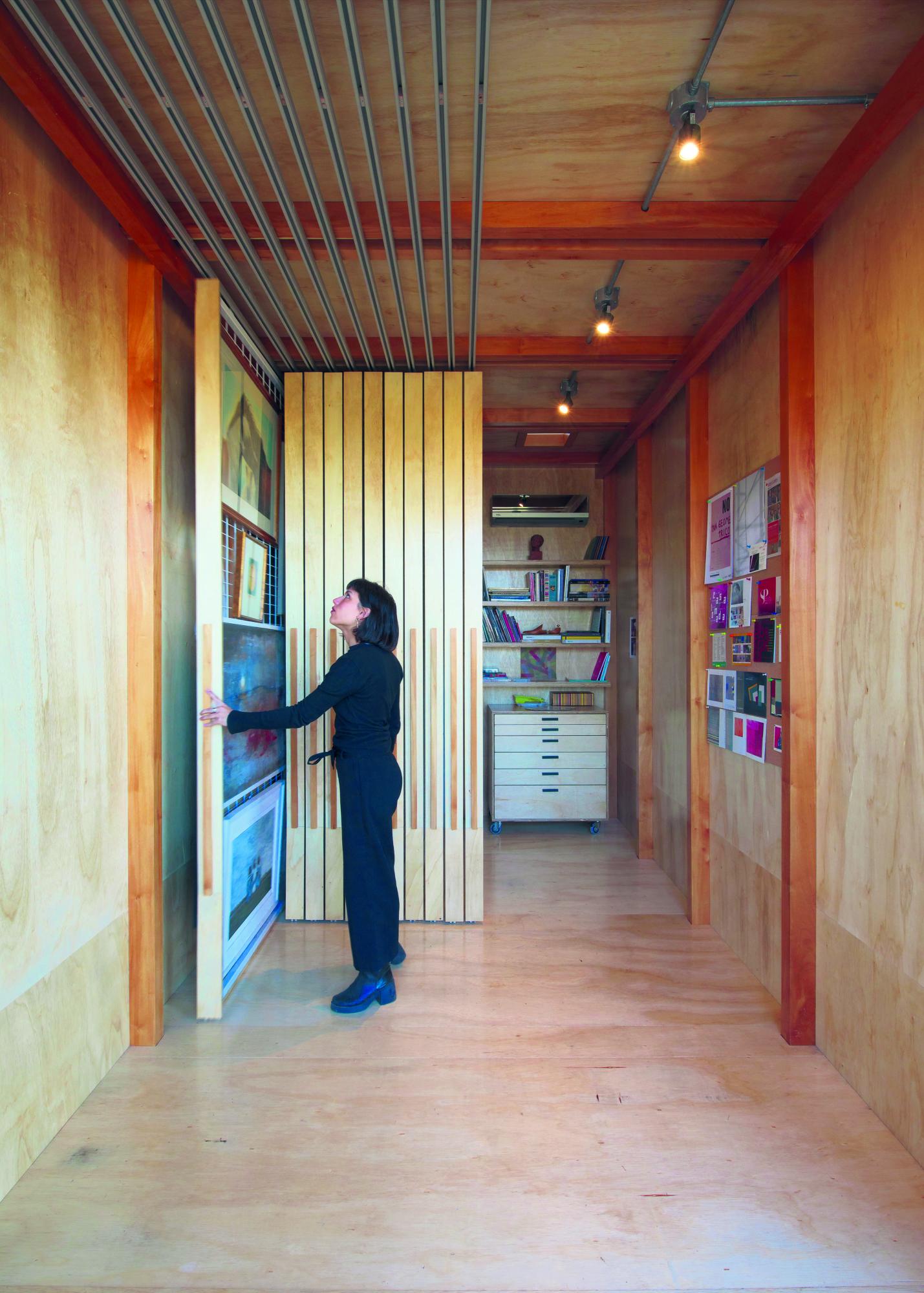 En el espacio interno se resuelven una serie de bastidores deslizables que permiten acopiar y exhibir los cuadros optimizando al máximo la superficie. Se incorpora también una biblioteca y un tablero de dibujo plegable proyectados con la misma lógica material.