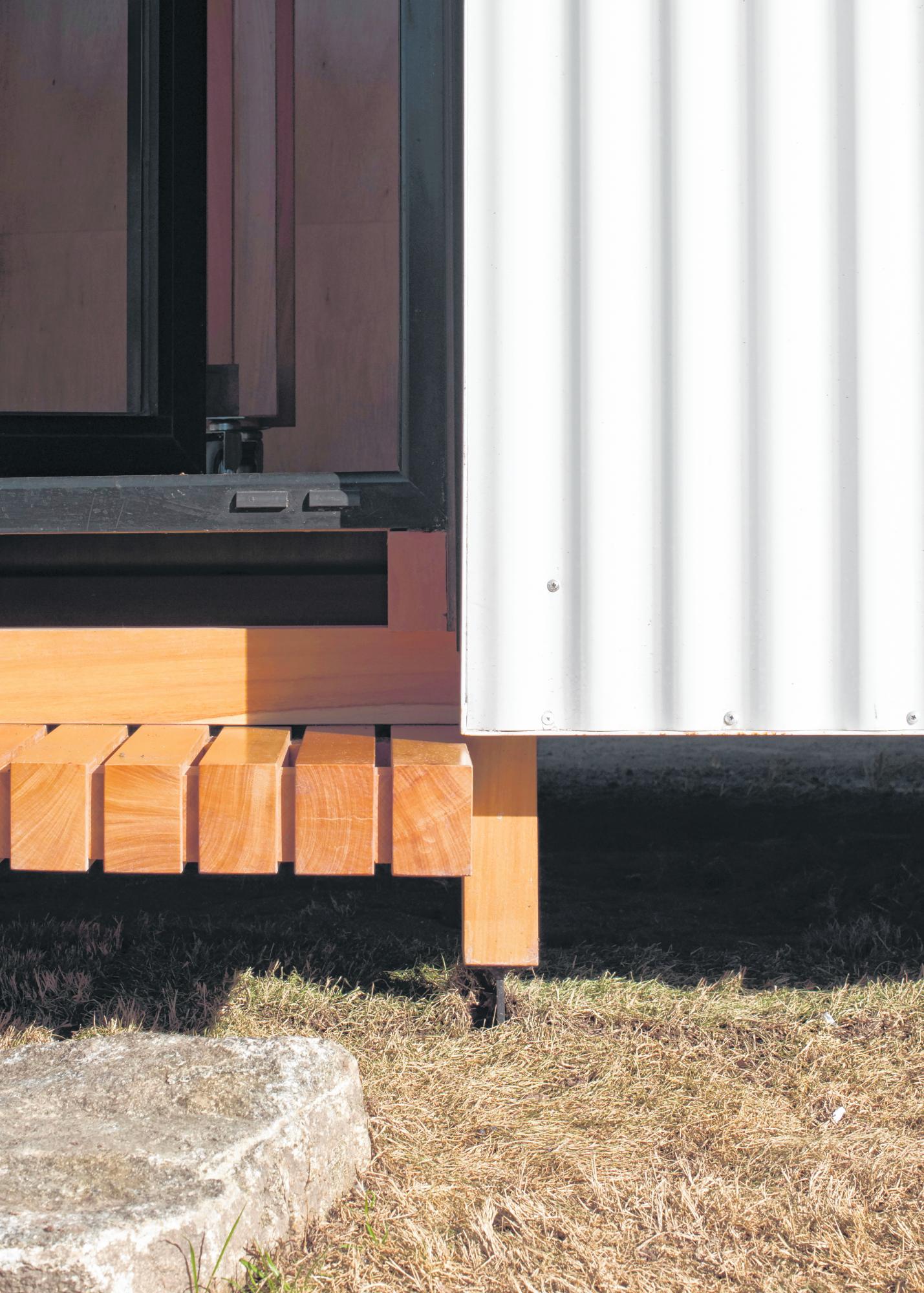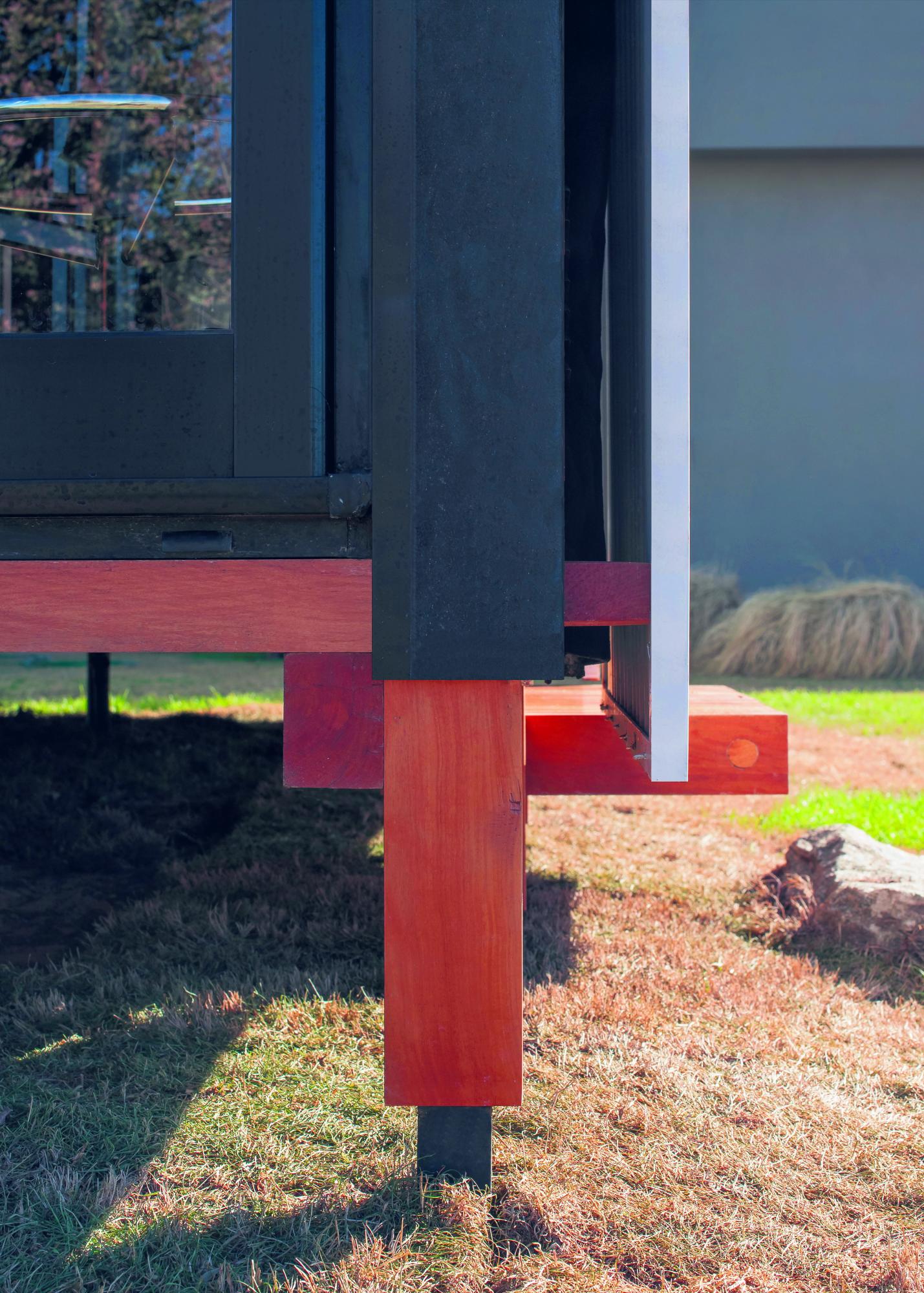 La estructura de vigas y columnas fue resuelta en madera maciza de Grapia 3” x 4” y la fachada ventilada con bastidores de chapa sinusoidal.