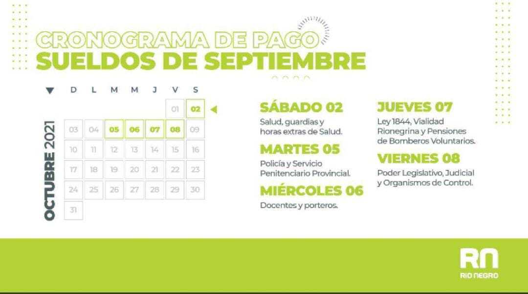 El cronograma de pago a la administración pública de Río Negro se inició el sábado 2 de octubre y se extenderá hasta el viernes 8. De esta manera, el sábado depositarán los haberes de sector Salud (incluyendo guardias y horas extras).