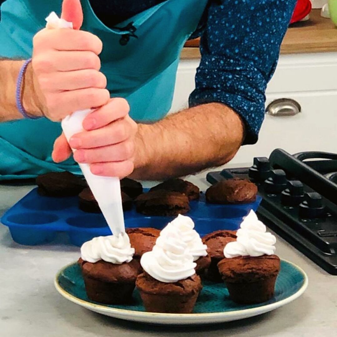 Para los muffins: Precalentar el horno. Hacer un puré con banana. Luego, mezclar todos los ingredientes líquidos (primero sin el aceite y luego de batir 10 segundos incorporarlo y batir 20 segundos más) y luego agregar la harina, el polvo para hornear, el cacao y las nueces picadas. Mezclar bien. Rellenar los moldes muffins. Cocinar los muffins en un horno moderado durante 30/35 minutos o hasta que estén.