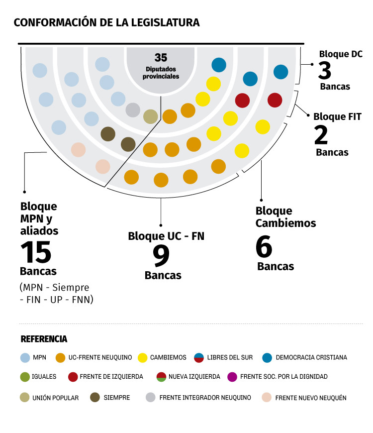 La Legislatura de Neuquén inicia un nuevo período con la renovación de la mayoría de sus bancas. Solo ocho legisladores fueron reelectos. El MPN y Unidad Ciudadana tendrán nueve representantes propios y Juntos por el Cambio quedará con seis.