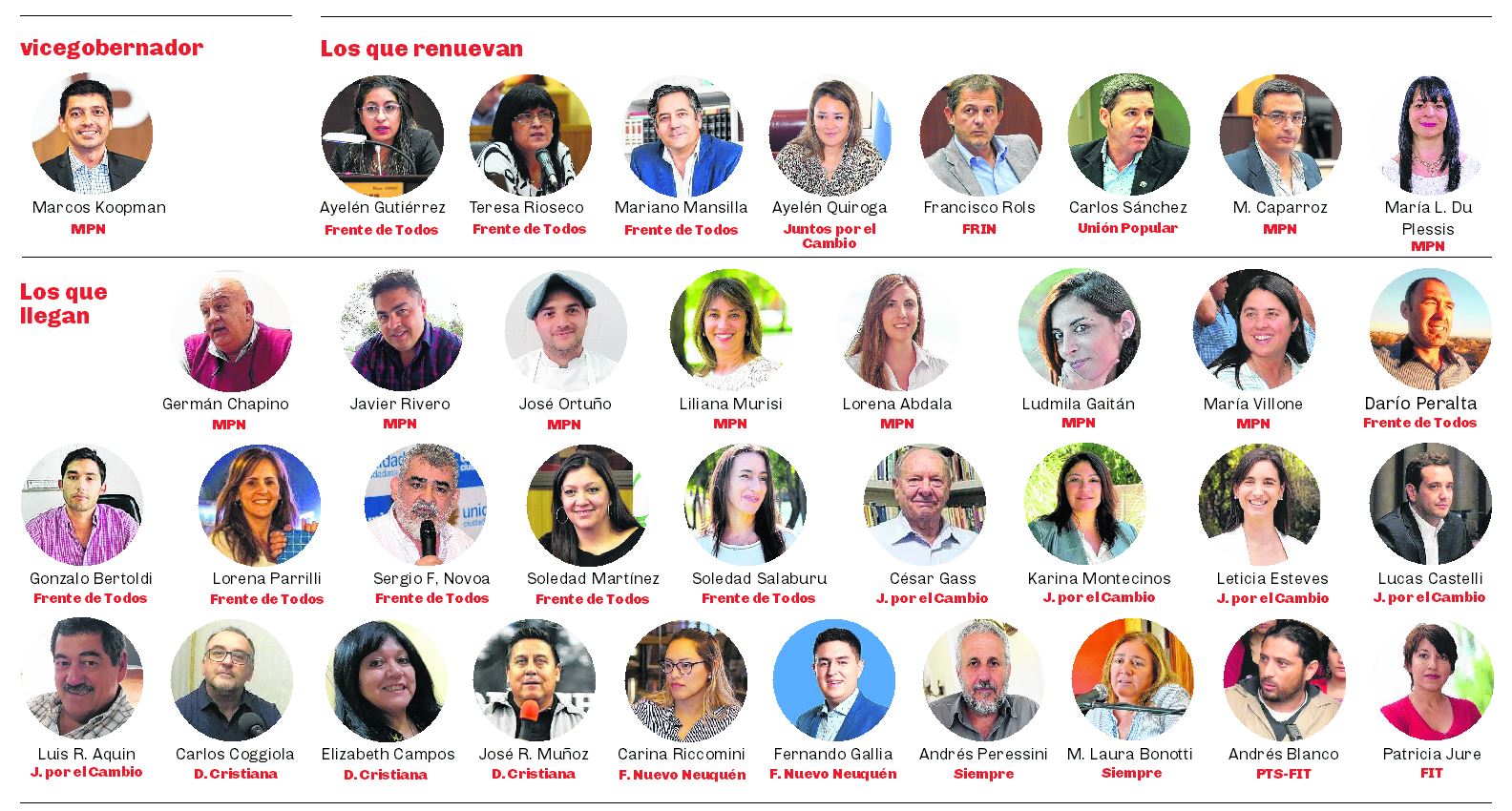 El MPN es mayoría, sumando a sus aliados. Lo sigue el Frente de Todos. Hay ocho nombres que se mantienen en sus bancas.