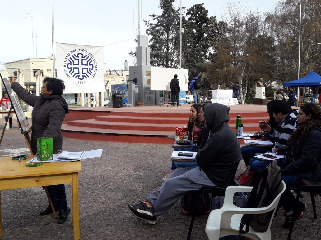 Desde las 9 de la mañana alumnos y docentes de la facultad con sede en Villa Regina comenzaron a instalar pizarrones y bancos en la plaza ubicada en el corazón de la zona céntrica de la ciudad, donde también se montó un laboratorio para el desarrollo de una de las clases públicas.