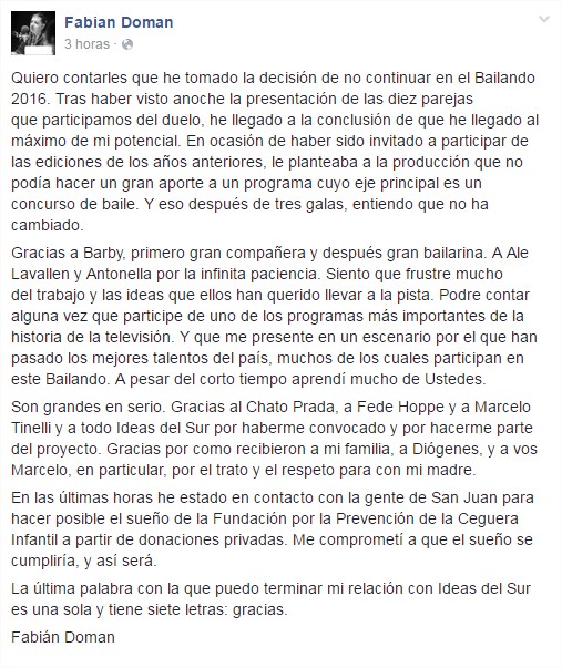 “Los motivos de mi renuncia al Bailando. Gracias @cuervotinelli”, tituló Doman en Twitter el link a su publicación: