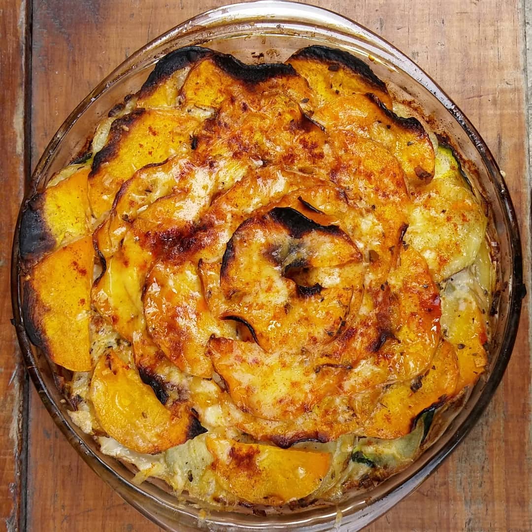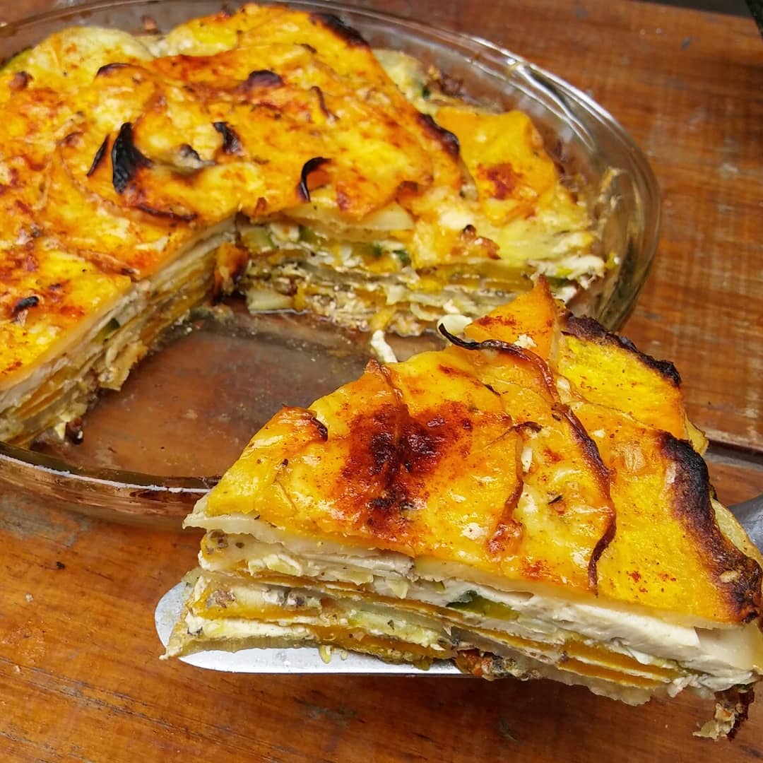 En un bol poner los huevos, la leche, el ajo picado y condimentar a gusto. Cortar todos los vegetales en rodajas muy finas. En un molde previamente aceitado colocar primero una capa de papas y agregar un poco de la mezcla de los huevos. Después hacer una capa de zapallitos y agregar nuevamente la mezcla de los huevos. Por último añadir la calabaza y volver a agregar la mezcla de los huevos. Repetir las capas hasta alcanzar el borde de la tartera. Cocinar por aproximadamente 1 hora en un horno fuerte. Si se quiere se puede colocar el queso fresco por arriba a la mitad de la cocción.