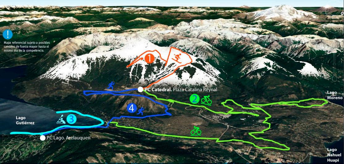 El tetra tuvo como escenario el cerro Catedral donde se realizó el tramo de esquí con una misión compleja para los competidores por la escasa visibilidad. También se recorrió en ciclismo por senderos y bosques de la zona oeste y trekking por el balcón del Gutiérrez (que en algunos sector debieron sortear nieve y hielo) y en el lago Gutiérrez se desarrolló la disciplina de kayak.