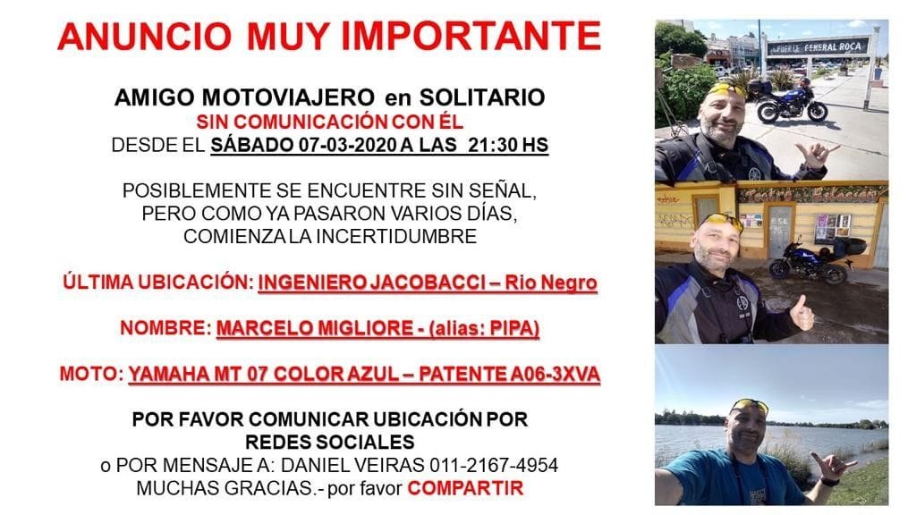 Desde Roca, allegados a Migliore dieron aviso a autoridades policiales de Jacobacci quienes se mantienen en alerta para tratar de ubicarlo ya que la última conexión habría sido en esa localidad.