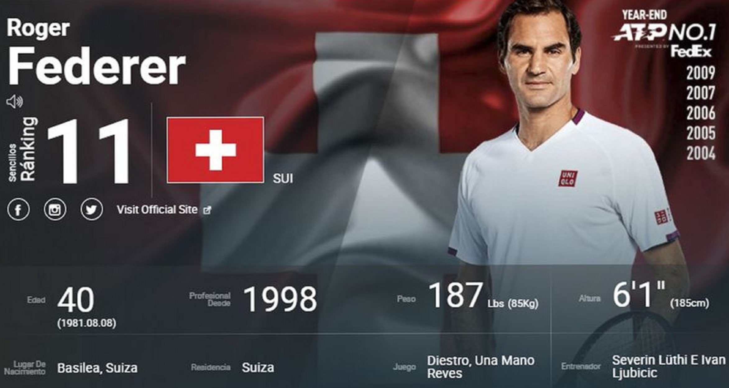 El Expreso Suizo quewdó undécimo en el listado que lidera el serbio Djokovic.