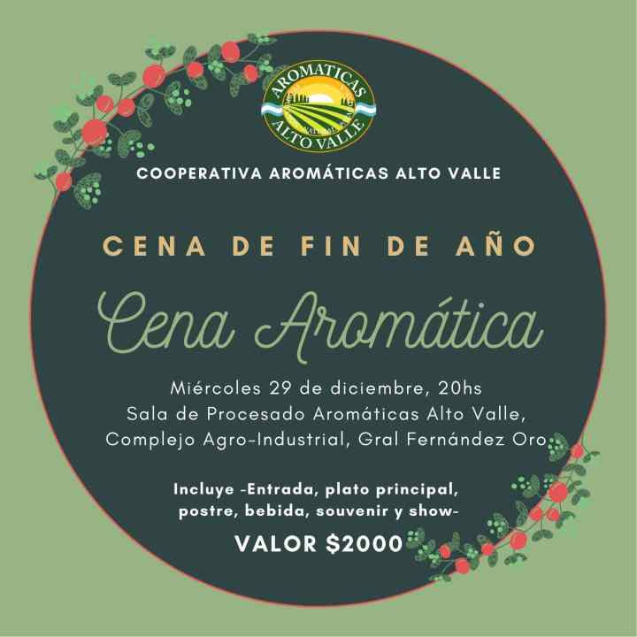 La Cooperativa Aromáticas del Alto Valle despide el año con una propuesta de cena diferente. Este miércoles 29, en el espacio de producción de la cooperativa, se acondicionarán las instalaciones y disfrutará de una noche sabrosa y aromada. La idea es dar a conocer los múltiples usos de las hierbas aromáticas a través de la comida.