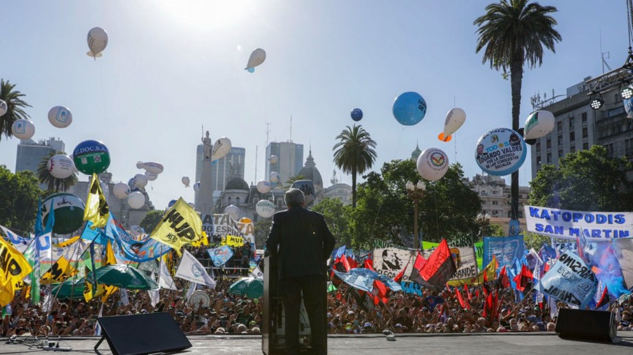 A metros de la Casa Rosada, el jefe de Estado tomó la centralidad de la actividad. El resto de los convocantes e integrantes del Frente de Todos siguieron el discurso desde abajo de las tarimas, sentados en unas mil sillas que se distribuirán en las cercanías.