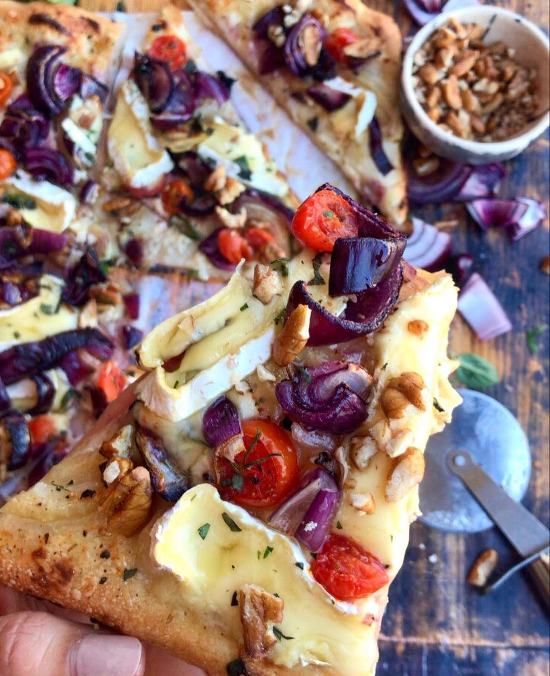 Típica de la región francesa de Alsacia. Tiene una base muy fina, similar a una pizza, pero no lleva levaduras. Y por encima le agregas lo que gustes. La sugerencia es de Romina Salina (@healthycooking.ar).