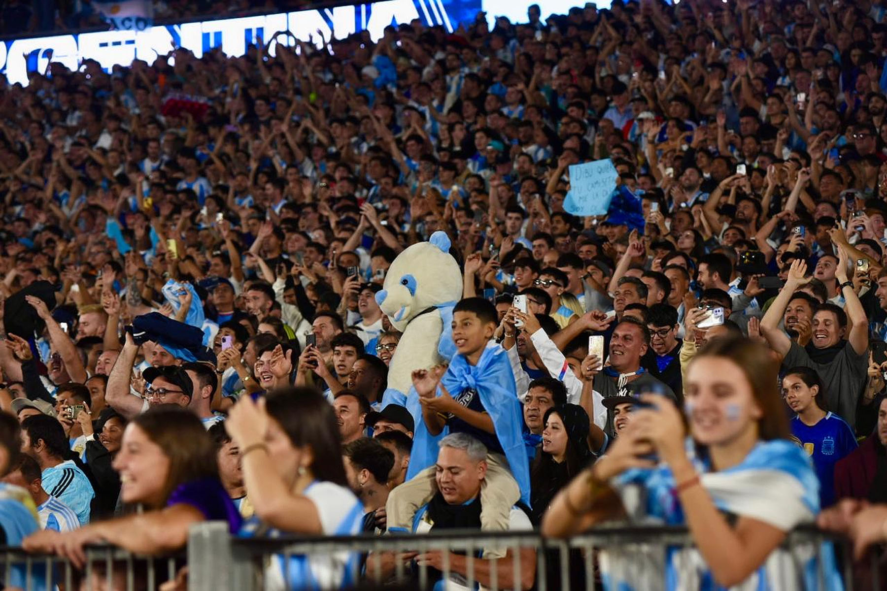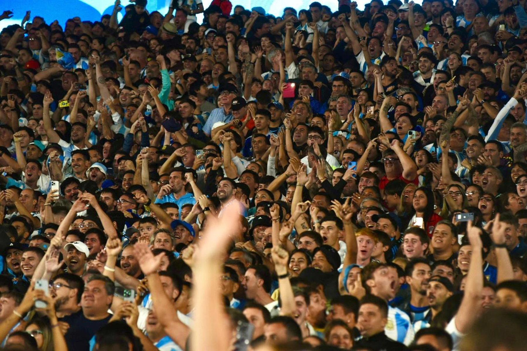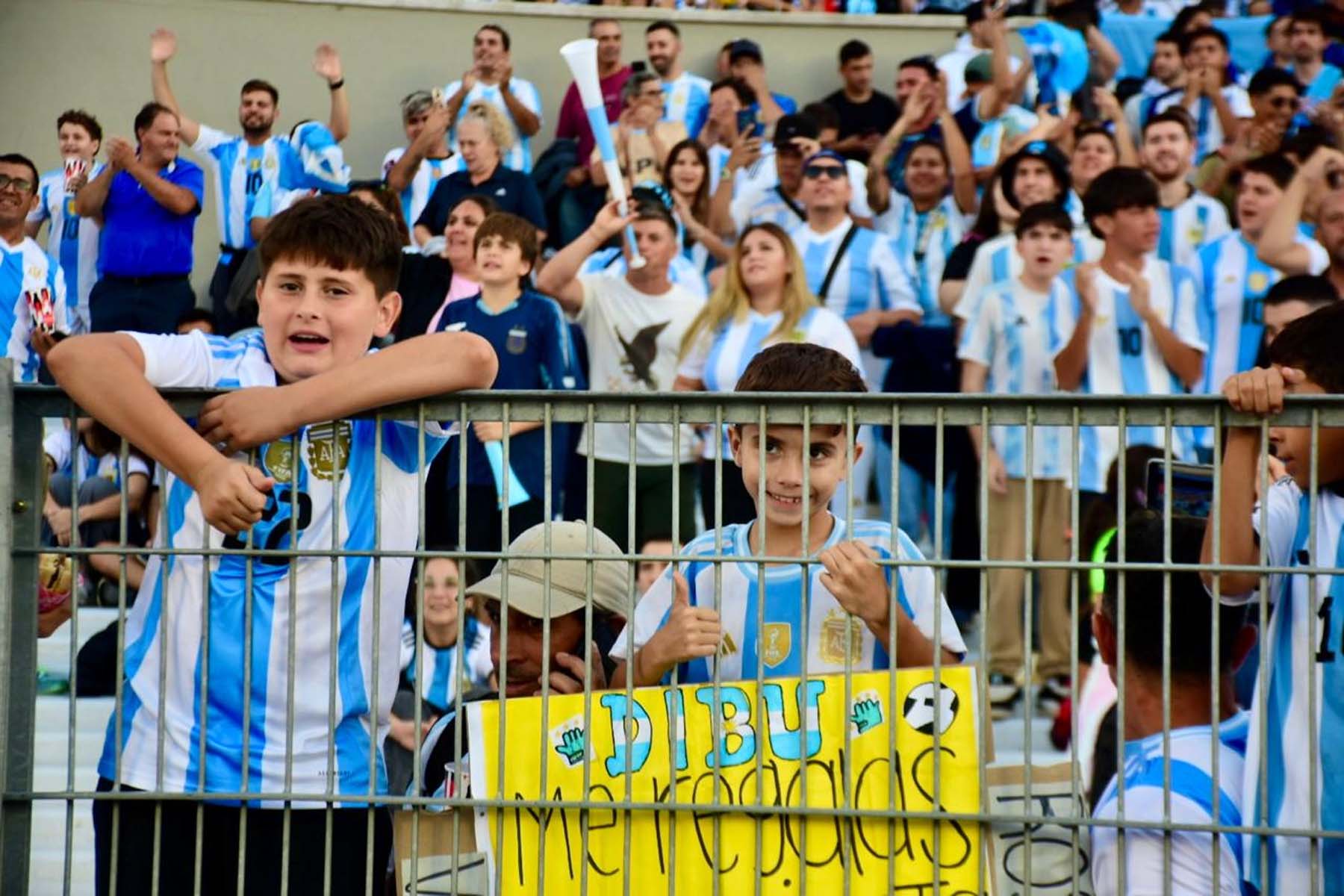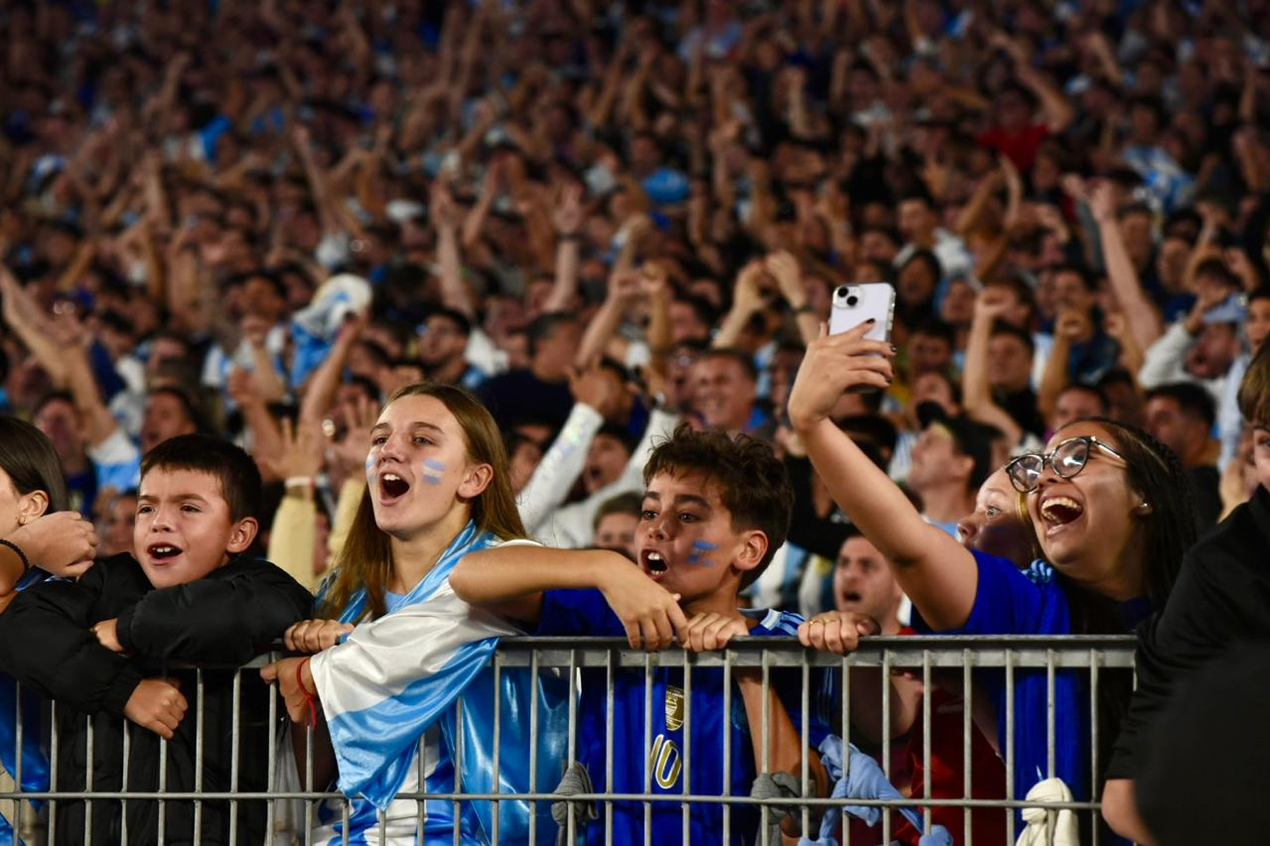 El celeste y blanco domina el color en el público con muchas camisetas de Julián Álvarez y Dibu Martínez, más allá de las de Lionel Messi que son amplia mayoría.