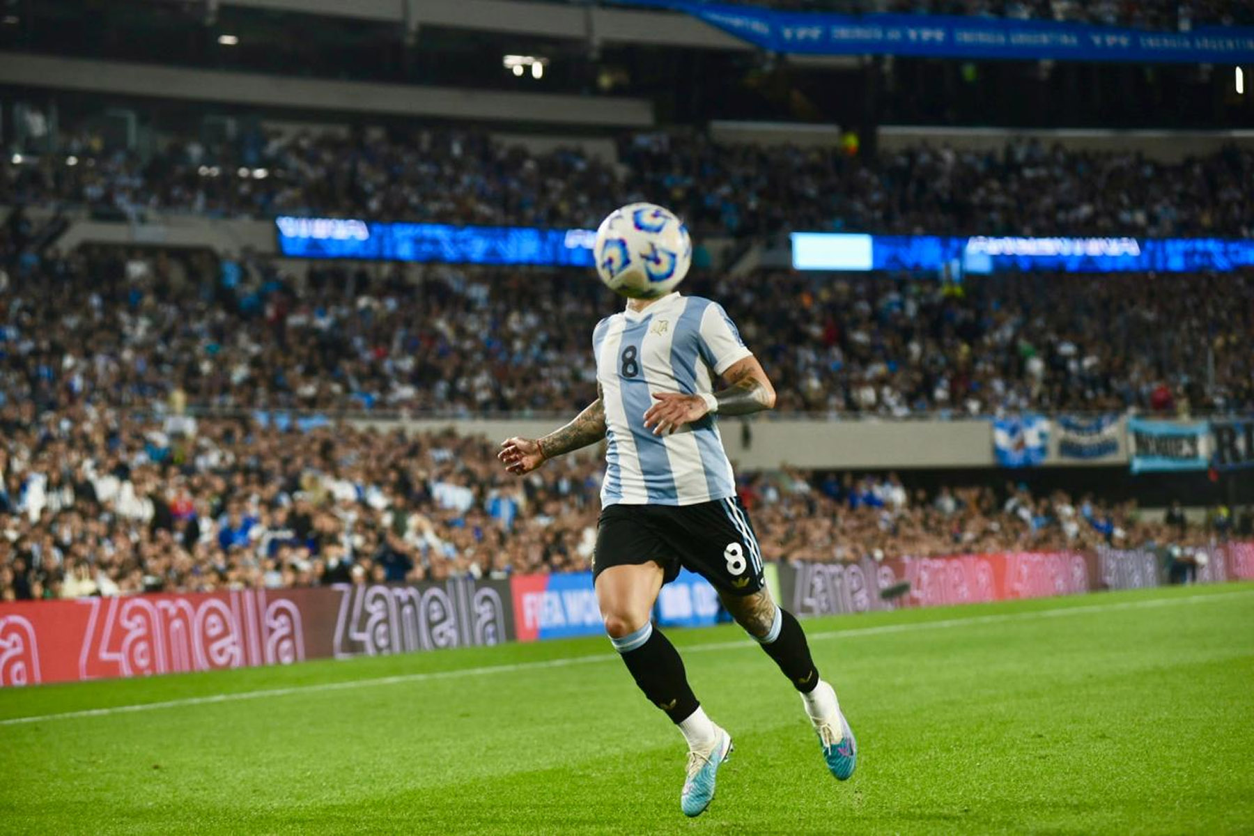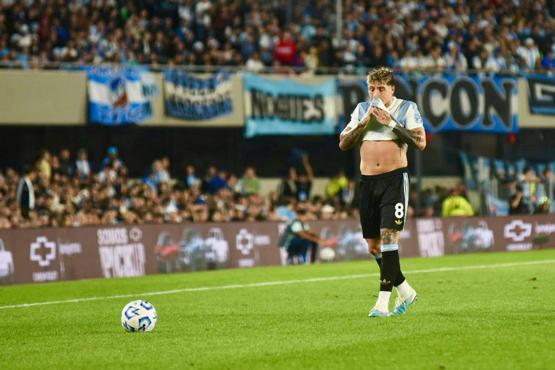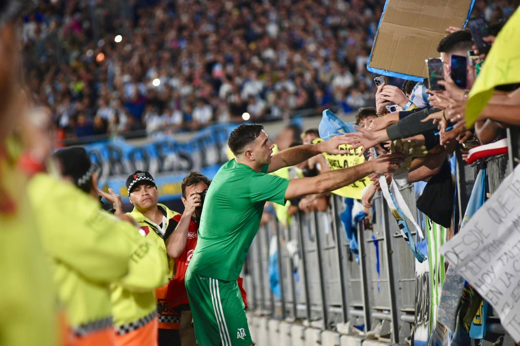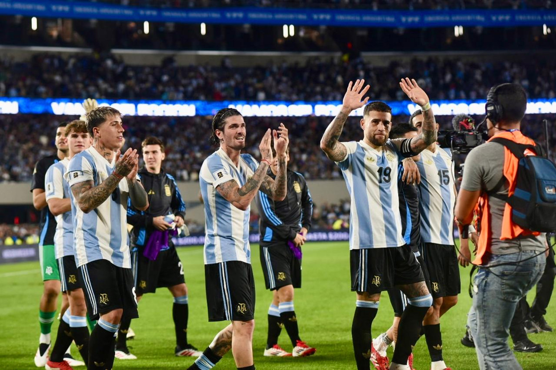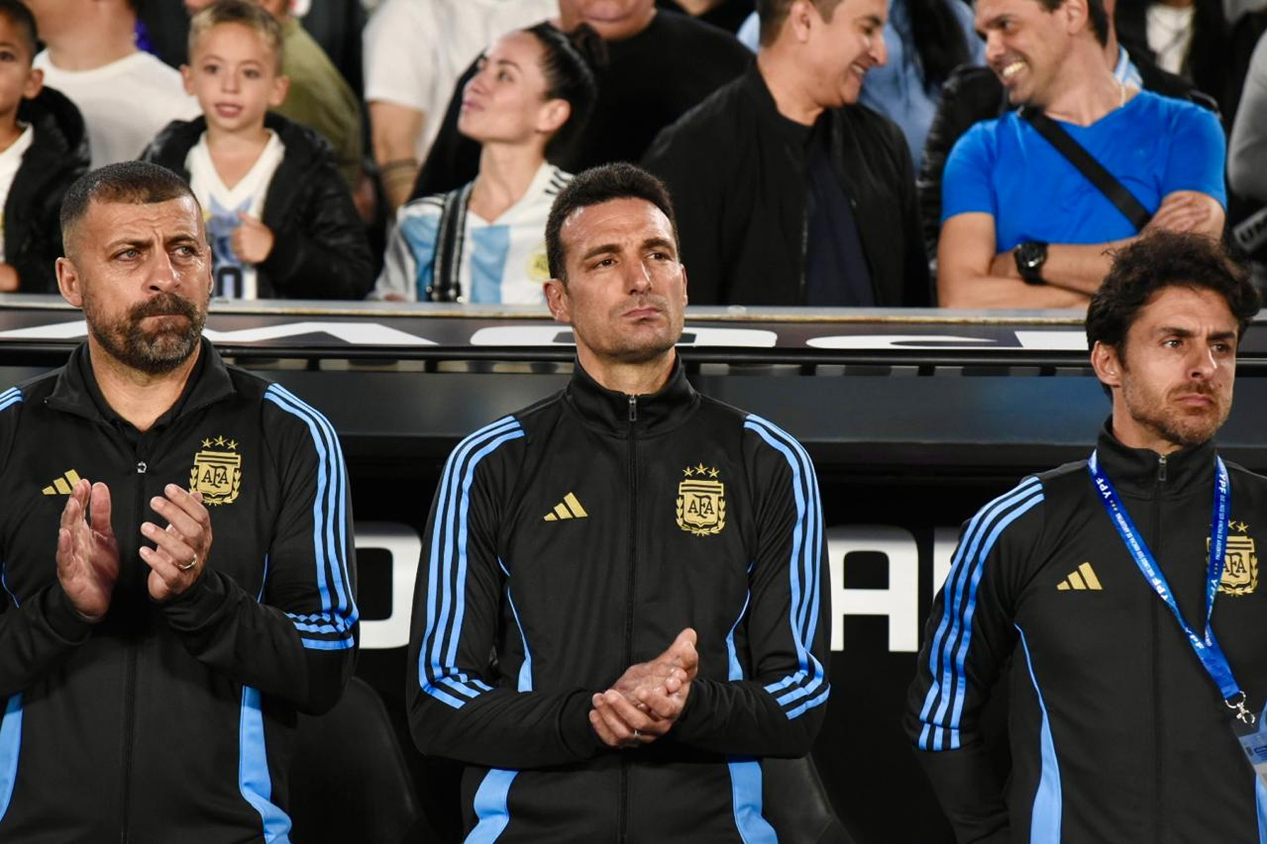 El celeste y blanco domina el color en el público con muchas camisetas de Julián Álvarez y Dibu Martínez, más allá de las de Lionel Messi que son amplia mayoría.
