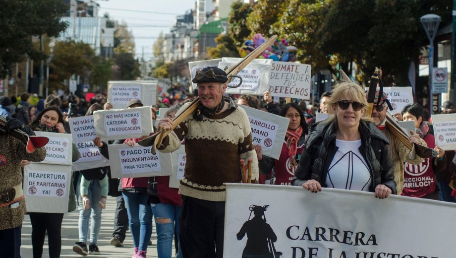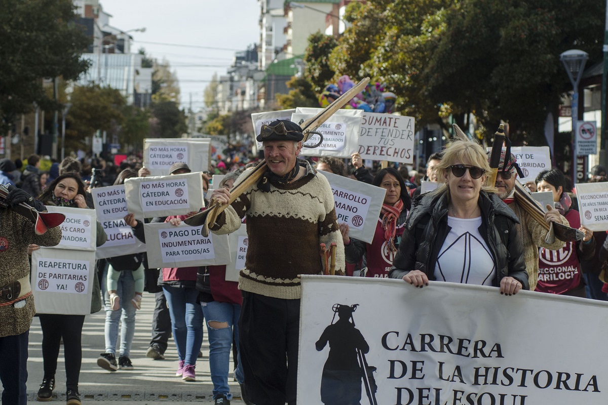 Tampoco faltaron cuatro referentes de la Carrera de la Historia del Esquí, vistiendo pulóveres de lana y esquíes de los años 50. Detrás, referentes de ATE Bariloche levantaron carteles: «No más aumentos en cuotas» y «Pago de indumentaria para todos».