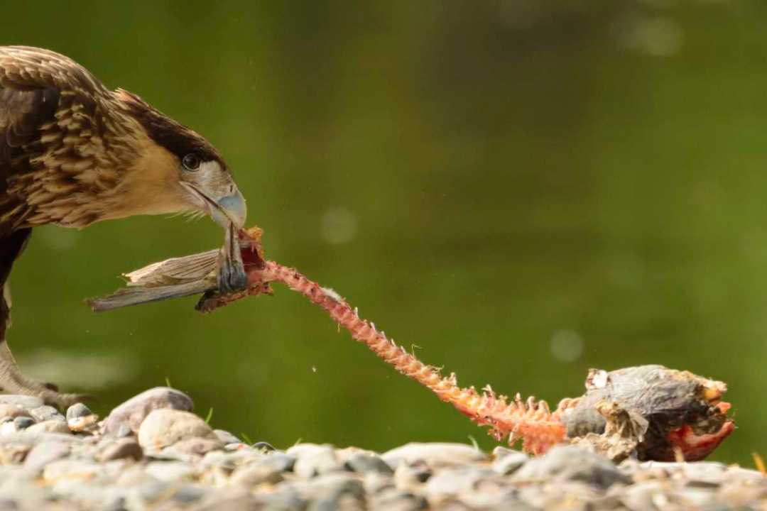 Carancho (Caracara plancus). Esta y otras especies carroñeras comunes en la zona, cumplen un importante papel en el ecosistema y son consideradas “aves limpiadoras”. En la foto puede verse alimentándose de los restos de una carpa (Cyprinus carpio).
