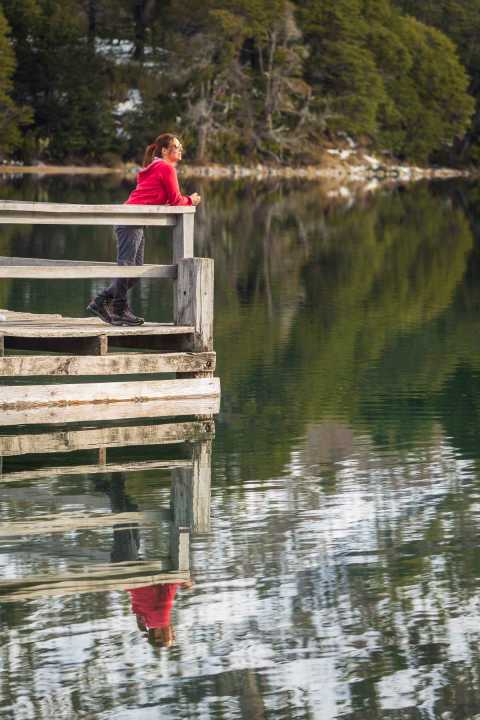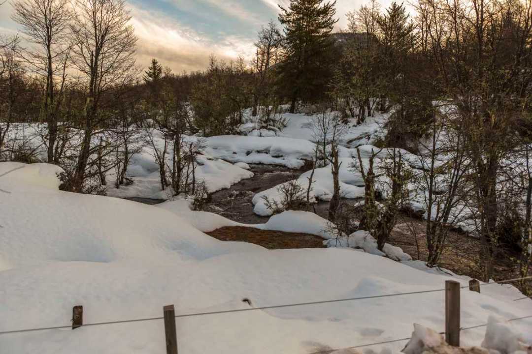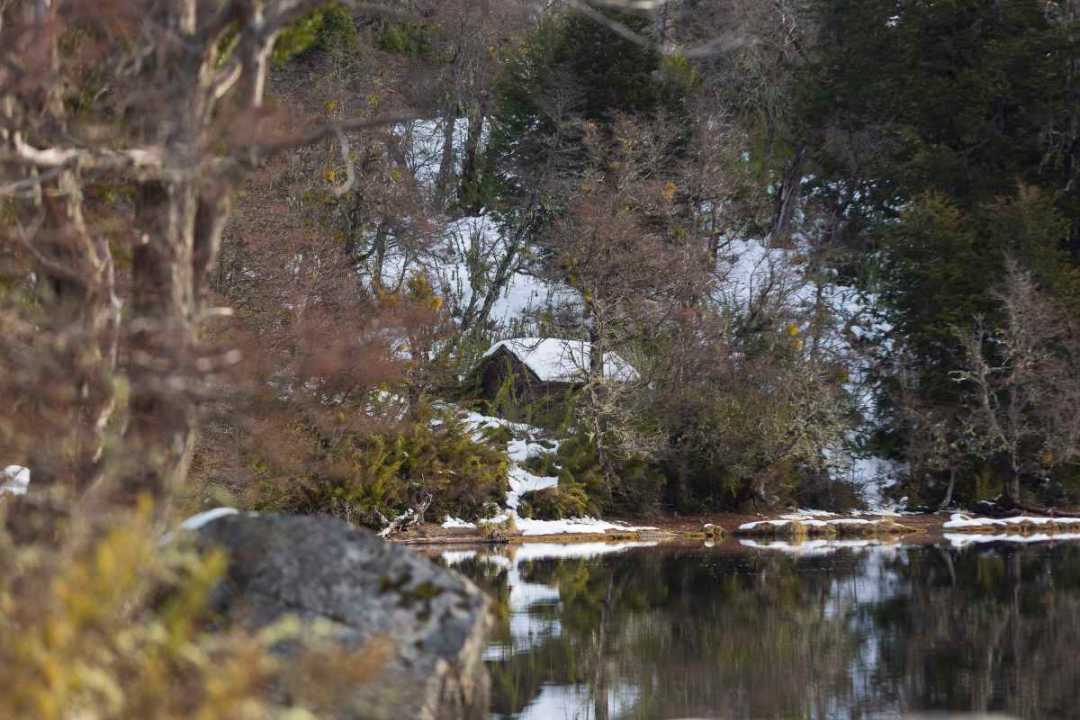 Algunos metros más, el camino cerrado por el bosque y la nieve en abundancia, nos llevó hasta la laguna pudu pudu, congelada y cubierta de nieve en sus orillas, faltaba poco, pero bastante “peludeado” el trayecto para llegar al muelle.