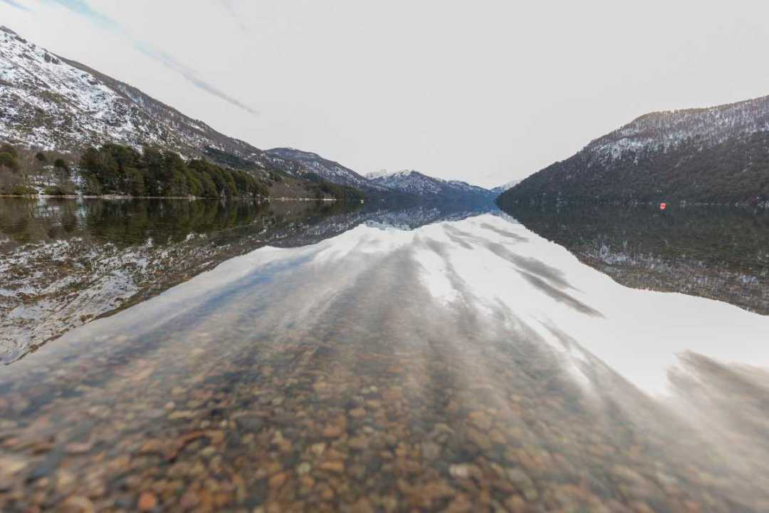 Llegados a destino, los ojos se llenaron de emociones y reflejos, la nieve afloraba, hasta los bordes del agua, una inusual calma en la superficie, nos dio un lago espejado, hermoso, superlativo.