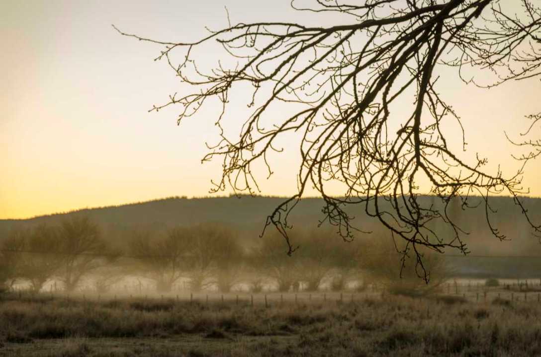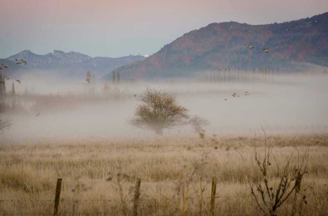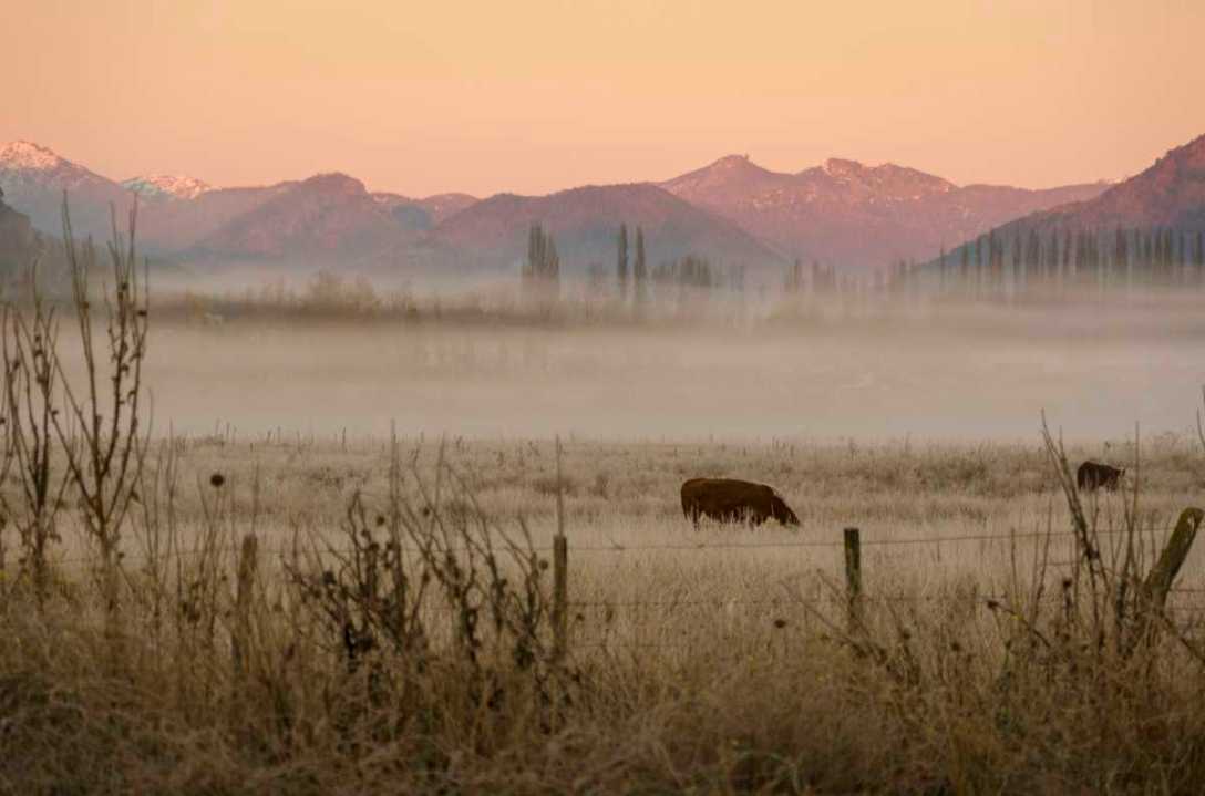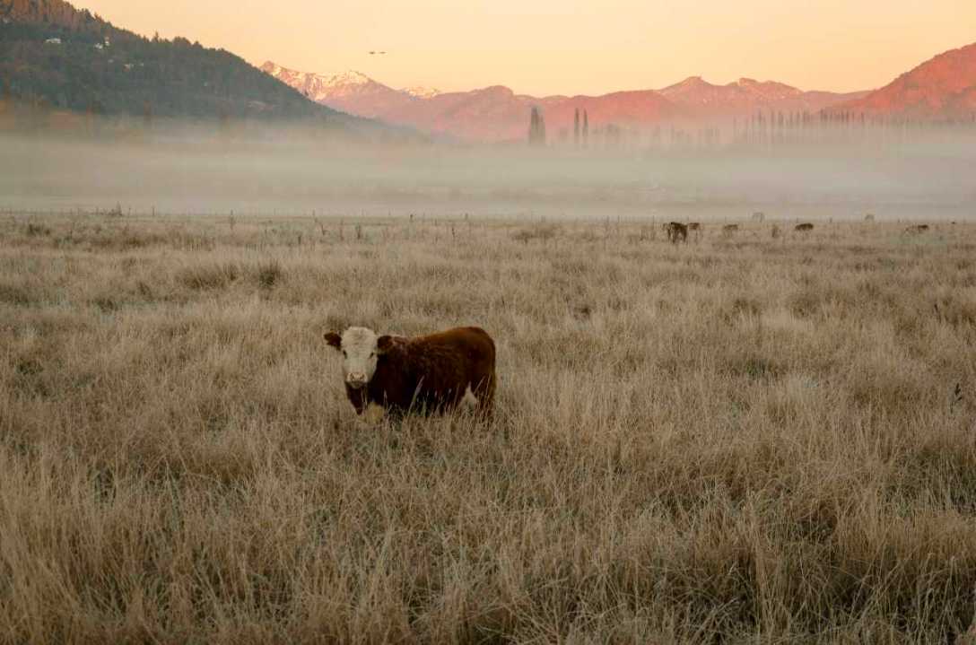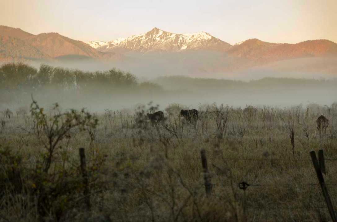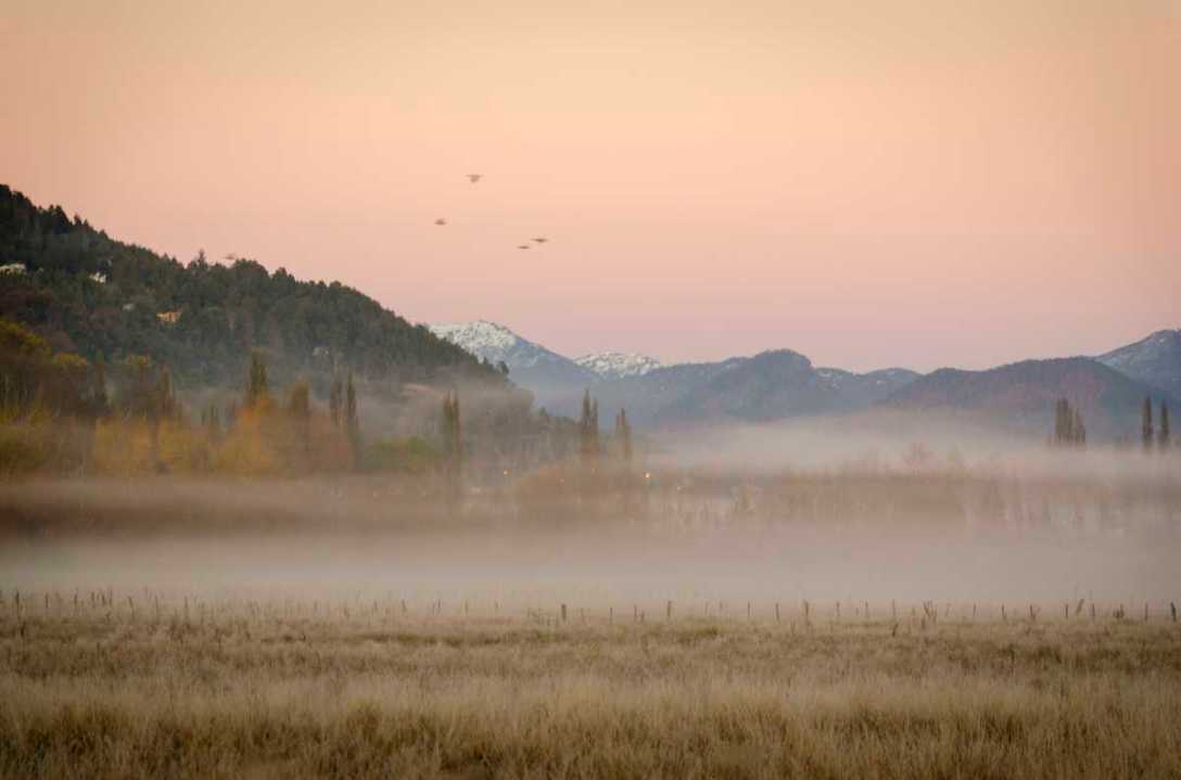 Cuando el sol empieza a dar sobre la helada, se produce este mágico efecto de nubes sobre las pasturas con las montañas de fondo. San Martín de los Andes o la rutina de lo extraordinario...