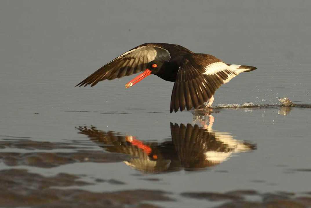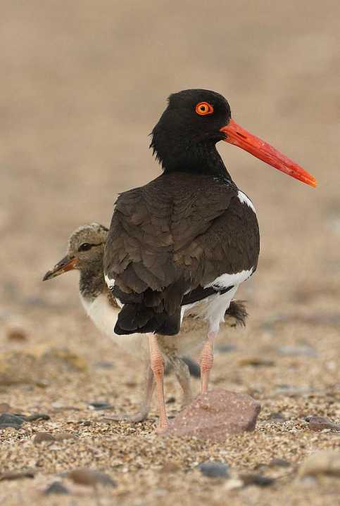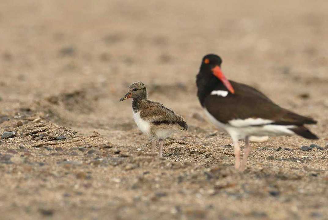 Lo más bonito que logré fotografiar fue un ostrero con un pichón. Lo pude descubrir porque el ostrero adulto buscaba comida en las lagunas que se formaban en la playa cuando la marea bajaba.