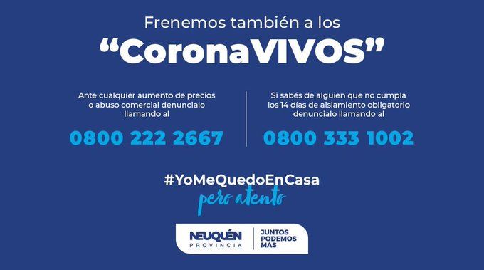 CoronaVIVOS. Así calificó el Gobierno de Neuquén a quienes aumentan precios o no cumplen los 14 días de aislamiento obligatorio. Y con ese término se inició una campaña para que sean los vecinos quienes denuncien estas situaciones.