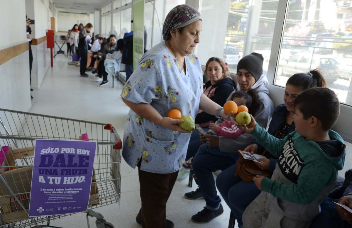 En el hall del hospital Ramón Carrillo de Bariloche, Livia Giorgi, vociferaba la entrega de frutas. En un carro de supermercado, esta trabajadora sanitaria llevaba un cajón con manzanas, peras y mandarinas que ofrecía a los pacientes en espera como parte de las actividades por el Día de la Alimentación Saludable.