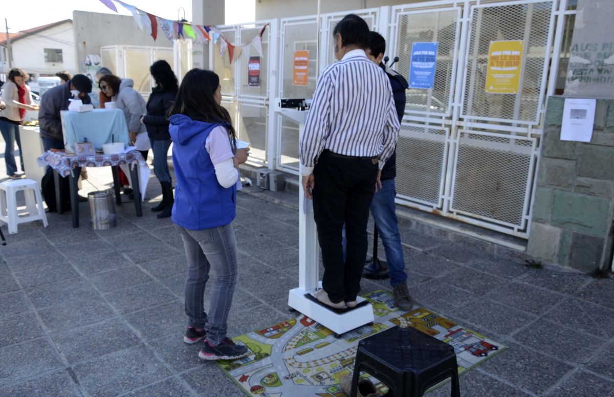 En este punto de la ciudad, en la transitada calle Onelli, algunos se animaban a realizar todo el circuito primero ofreciendo sus datos personales que tomaban trabajadoras sanitarias del programa Redes. Luego pasaban por un control de presión, una rayuela, más adelante por una balanza y un juego de “gallito ciego” para detectar qué fruta se degustaba.