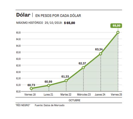 Pesimismo. En el último día de operaciones antes de las elecciones presidenciales el dólar tocó su récord a pesar de la intervención, con ventas y subastas, del Banco Central y los bancos públicos: aumentó $1.66 y llegó a los $65 en el promedio. El monto operado también fue récord. Las versiones paralelas se dispararon: el blue llegó a los $75,75 y el “contado con liqui” supero los $80. En sucursales bancarias de la City porteña se generaron colas de clientes que retiraron sus depósitos en dólares: en algunas entidades se registraron restricciones tanto para la compra como para el retiro de los depósitos de las cajas de ahorro en moneda extranjera. Se especula con un feriado cambiario y bancario el lunes.