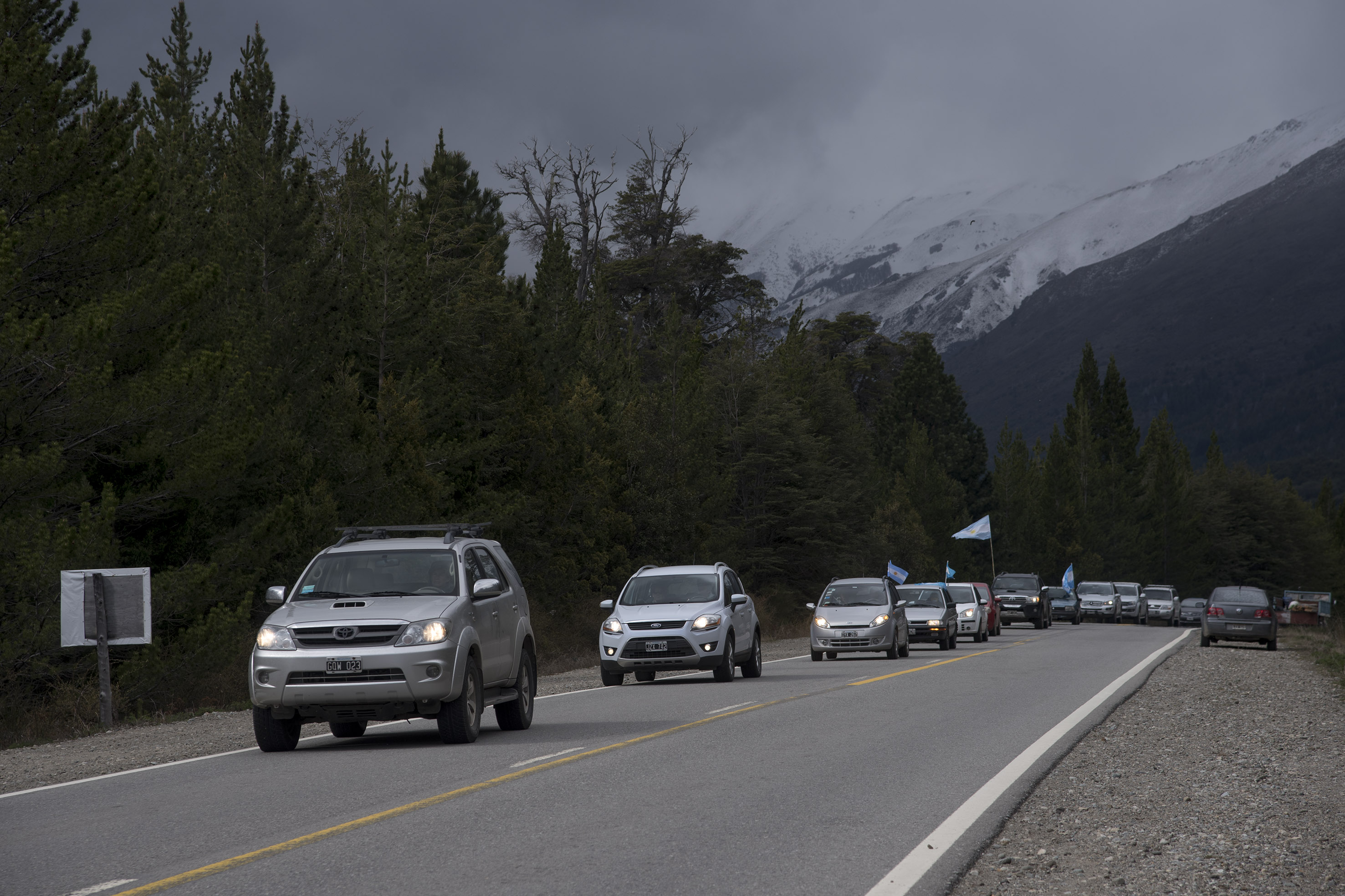 Cerca de 400 personas se movilizaron en caravana hasta la ruta nacional 40 Sur, para reclamar el cese de la violencia. Exigieron al gobierno nacional que haga cumplir las leyes y proteja el Parque Nacional Nahuel Huapi. Repudiaron la toma de tierras a manos de la comunidad mapuche Lafken Winkul Mapu.