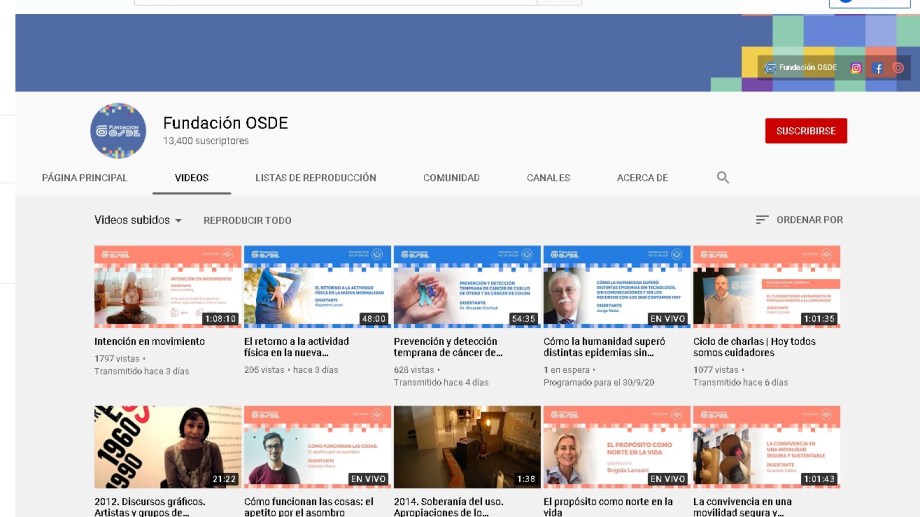 El canal de Fundación OSDE en la plataforma de YouTube, que tenía hasta abril 1.449 seguidores, en septiembre alcanzó ya los 13.400. Los contenidos se corresponden con los ejes de prevención y salud, arte y cultura, innovación, sociedad y sustentabilidad.