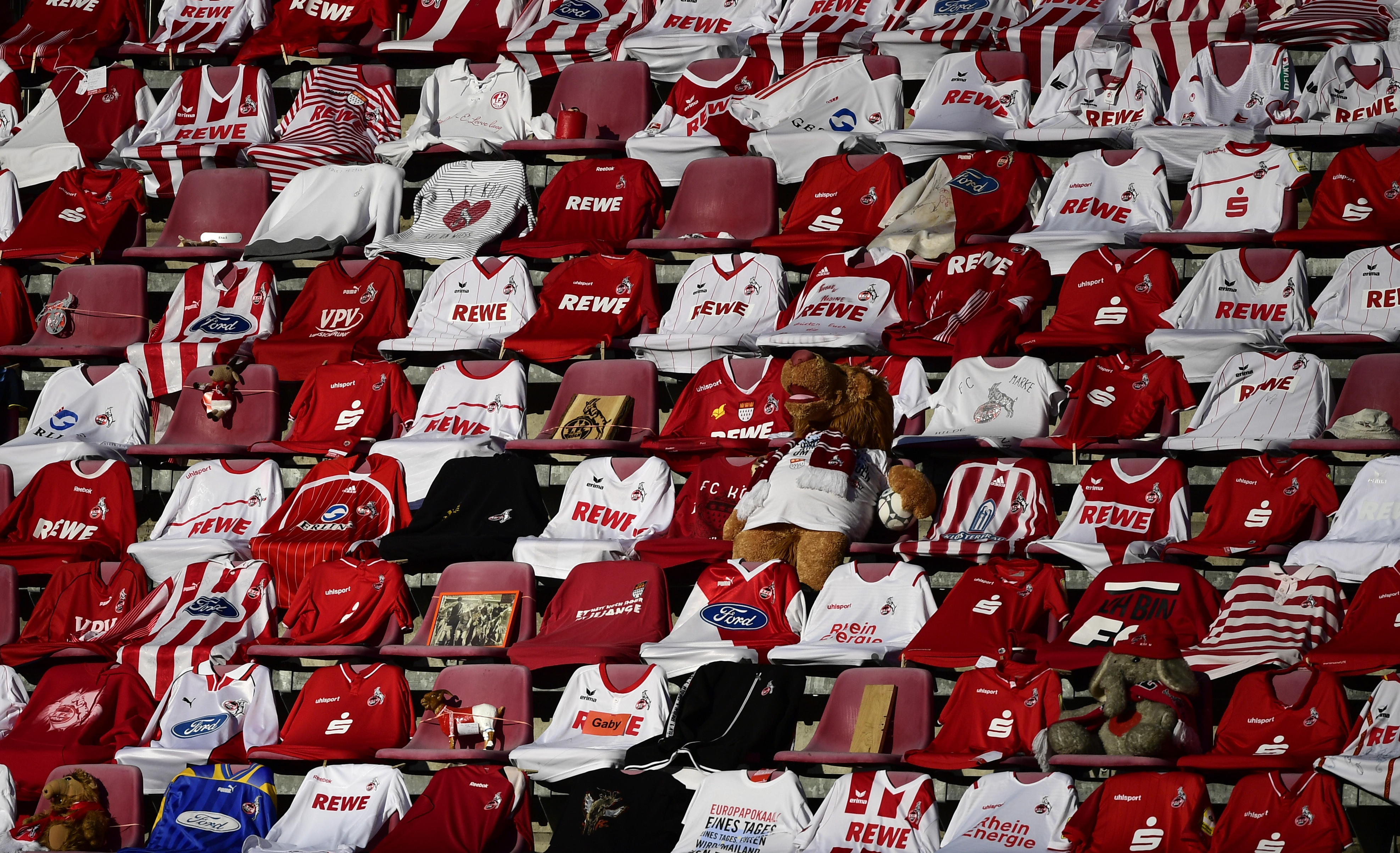 Camisetas del Colonia FC en las butacas vacías del estadio, en el partido ante el RB Leipzig, por la Bundesliga el pasado 1° de junio. (Foto/AP)