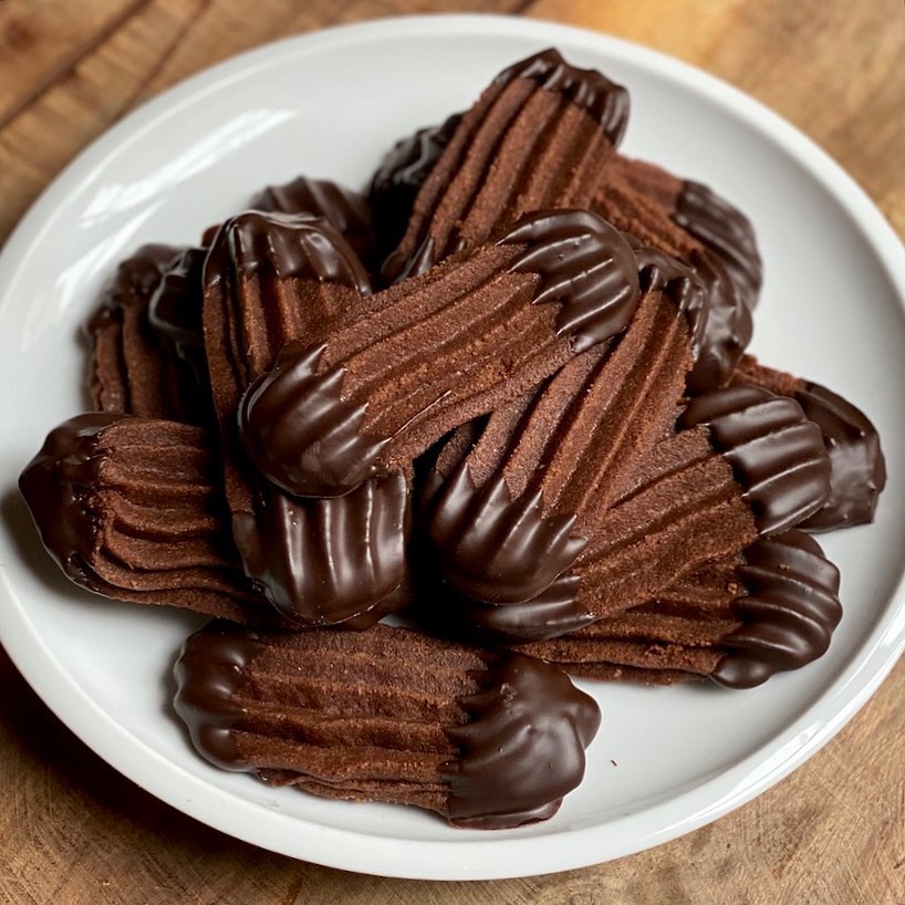 Llevar al frezer 30 minutos de esta manera no se deformarán durante la cocción. Cocinar en horno a 180º C durante 18 minutos. Fundir el chocolate y bañar cada extremo de la galleta.