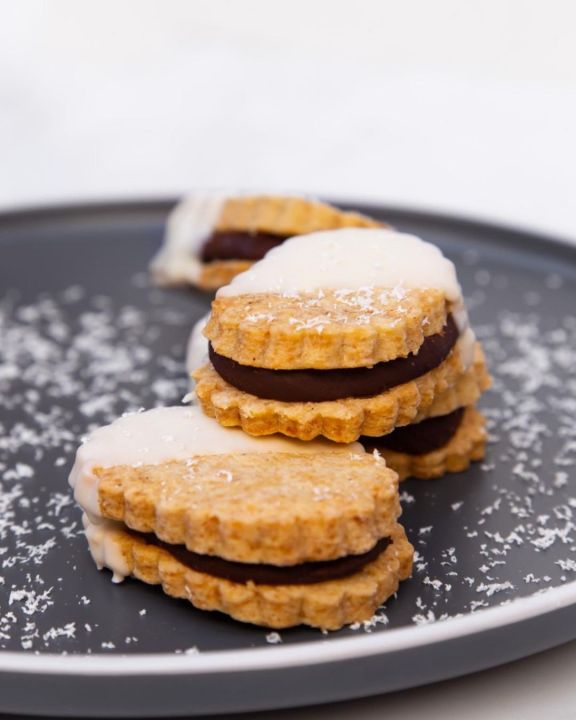 Armamos el alfajor colocando el relleno sobre una de las tapas y cubriendo con la otra. Bañamos con chocolate negro y blanco y dejamos enfriar a temperatura ambiente.