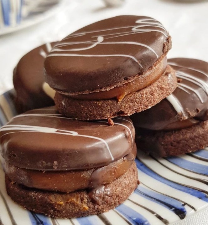 Armar los alfajores con este relleno en el medio o simplemente con dulce de leche. Bañar con el chocolate, lo podés derretir a baño de maría y decorar con nueces o hilos de chocolate de otro color.