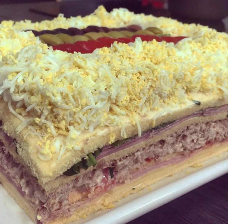 Colocar una última capa de pionono, pintar con mayonesa, espolvorear huevo rallado y aceitunas cortadas en rodajas. Enfriar en la heladera. Sacarlo unos minutos antes de servir.