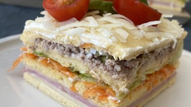 Colocar un pionono y untarlo con la mezcla de atún. Poner encima otra capa de pionono, untarlo con la mayonesa y colocar el tomate en rodajas. Colocar una nueva capa de pionono y una capa de queso y otra de jamón. Realizar este proceso dos veces.