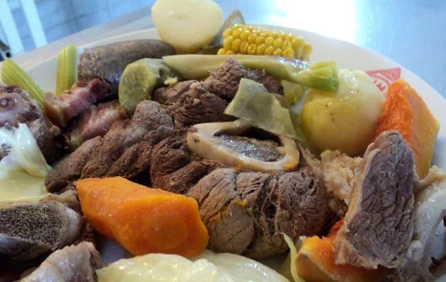 Después de cocinar todo durante 5 minutos más, colocar el choclo cortado en ruedas y seguir 7 minutos más. Apagar el fuego. Servir las verduras y la carne, acompañándola con una buena mostaza. Este plato es rico en variedad de sabores.