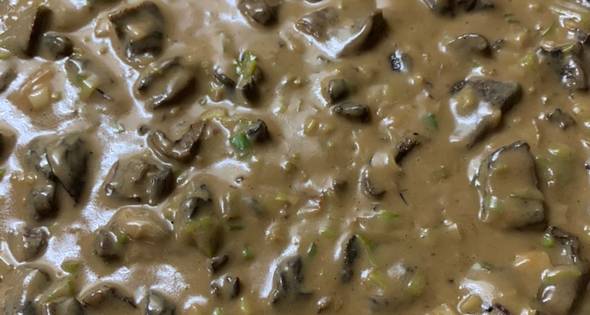 Agregar el vino en el que se hidrataron los hongos. Cuando se reduce, agregar la crema de leche, integrar todo y le agregar la leche.